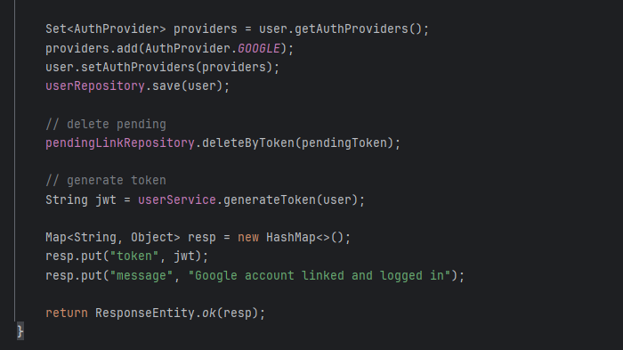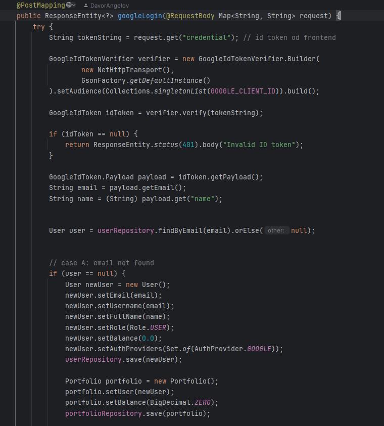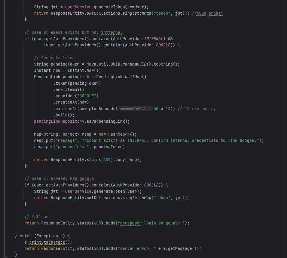 case C: Корисникот постои со google акаунт, се креира JWT и се враќа на frontend.