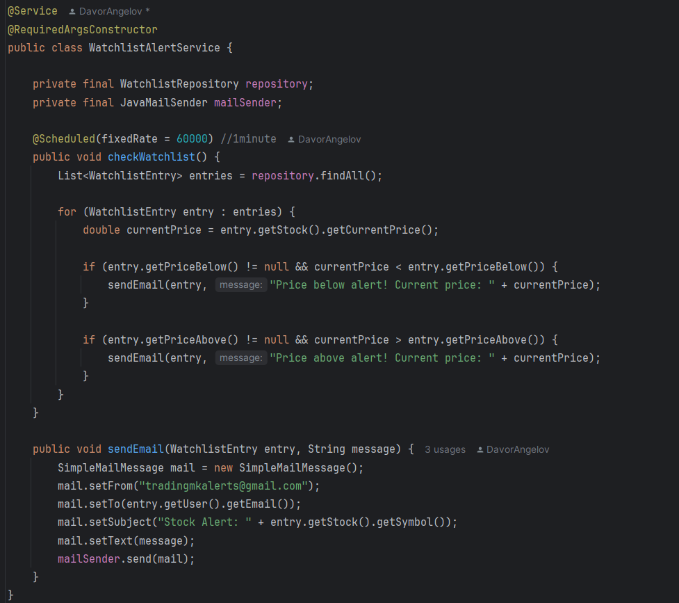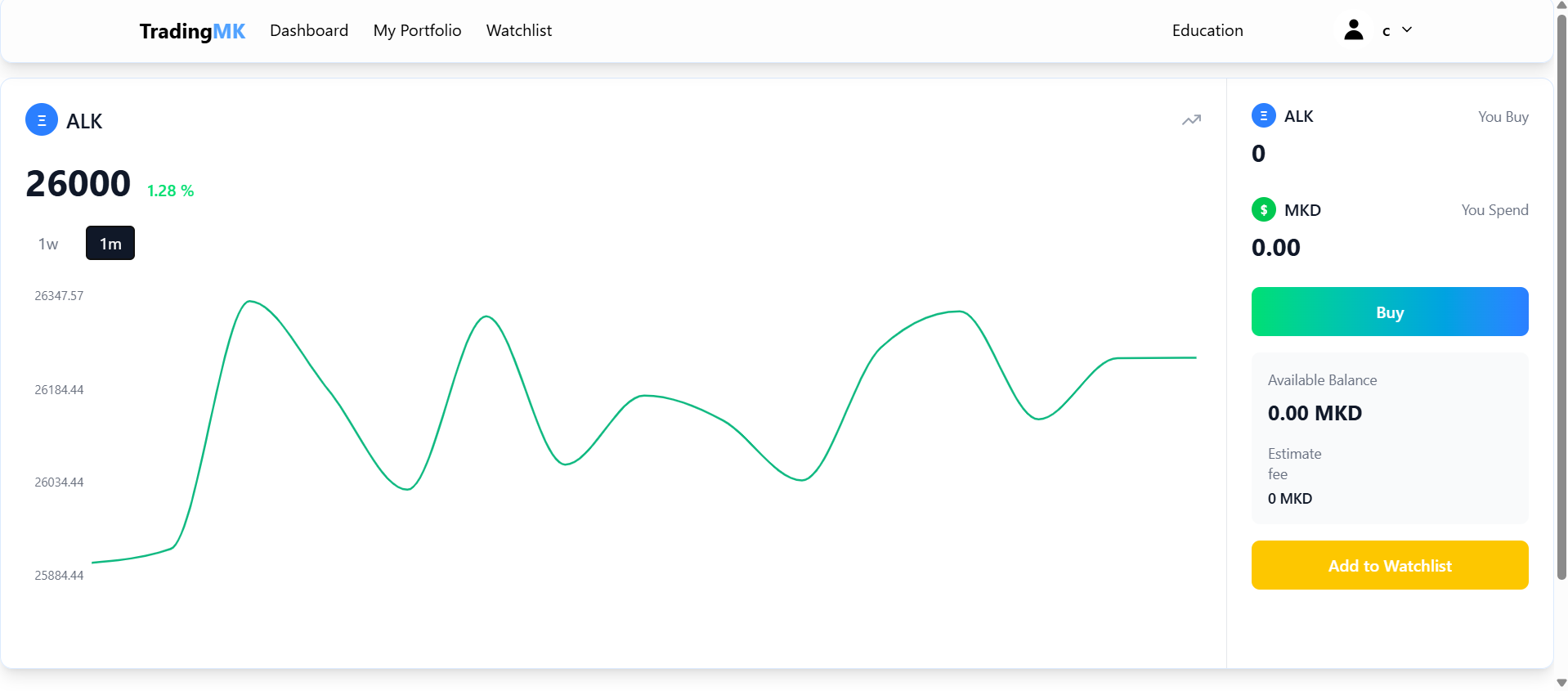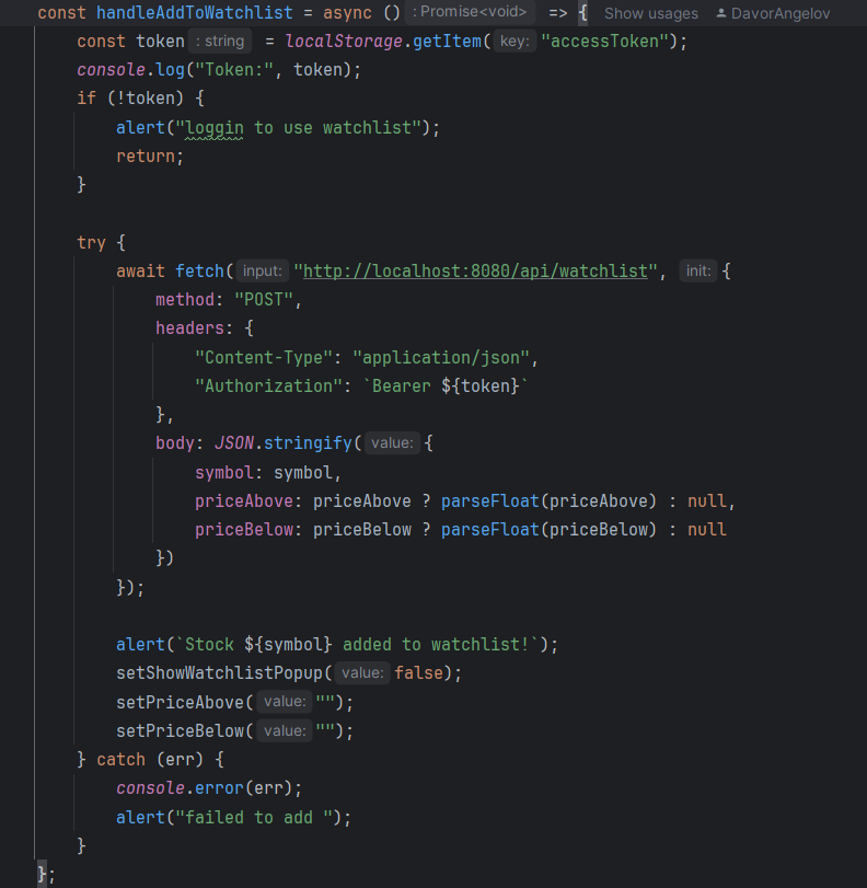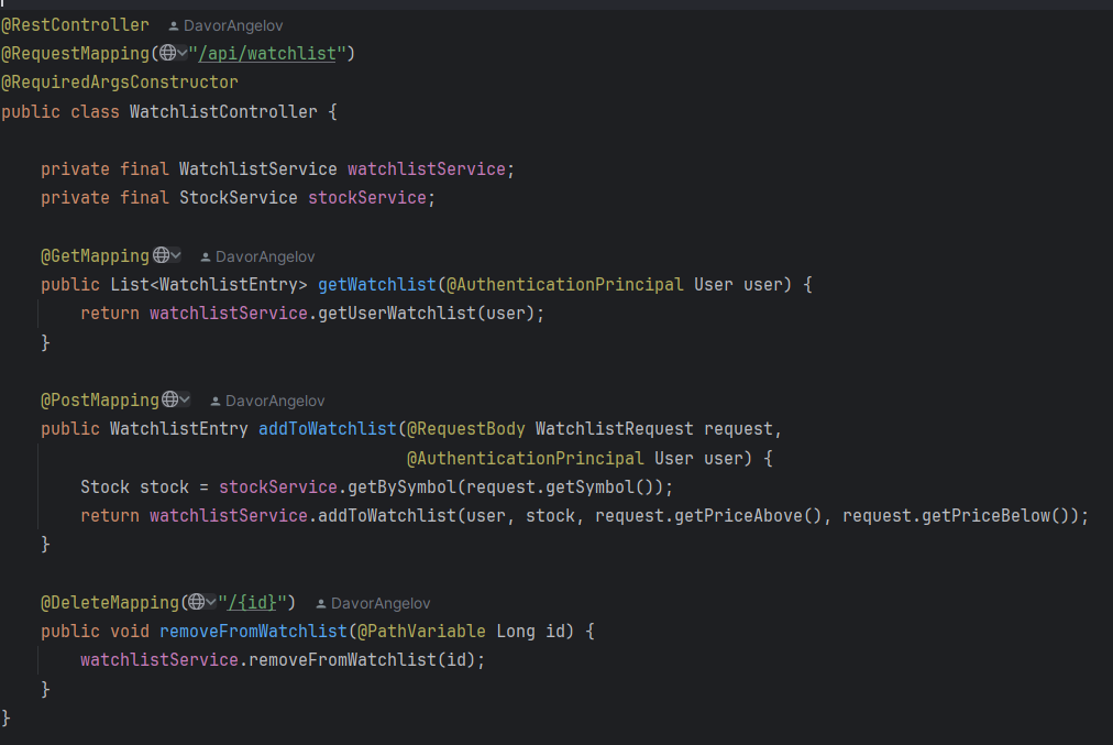 Во backend, GET /api/watchlist-враќа листа на акции за тековниот корисник. POST /api/watchlist- додава нов WatchlistEntry, DELETE /api/watchlist-брише entry.