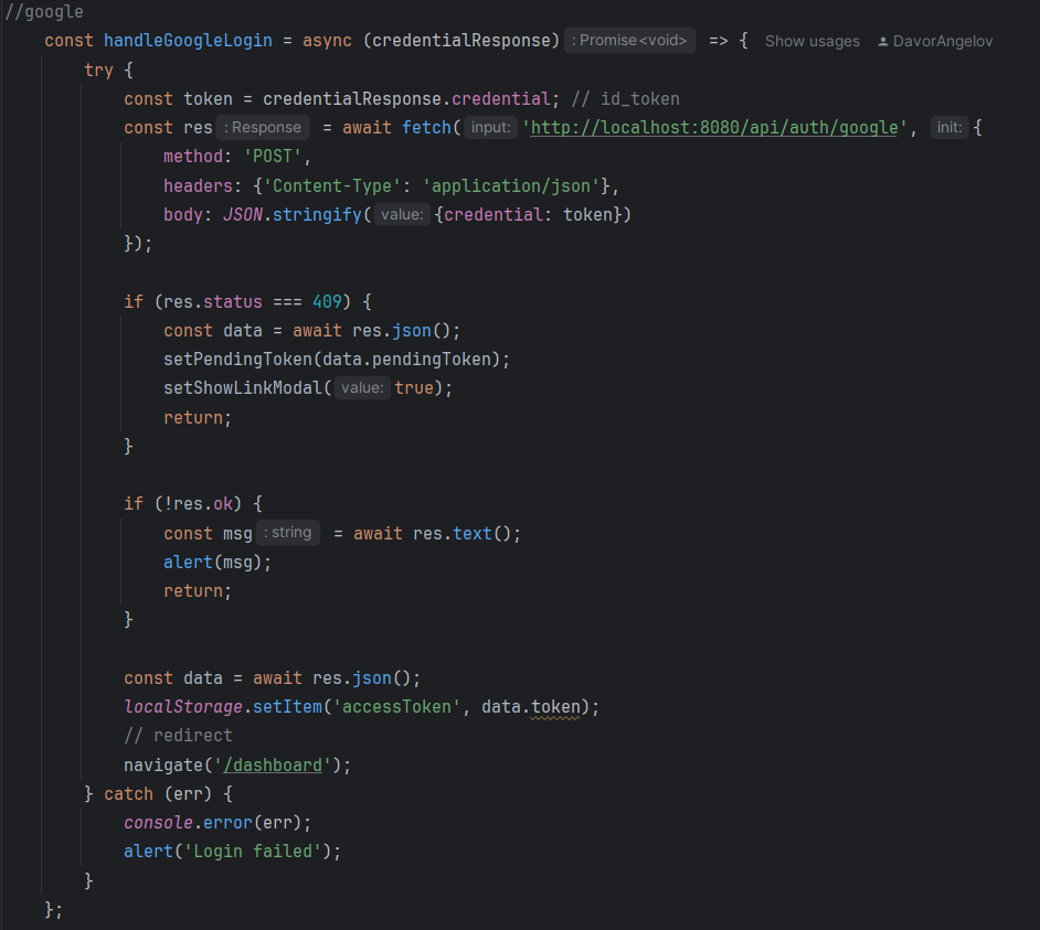 Компонентата GoogleLogin од @react-oauth/google се користи. На onSuccess, се повикува handleGoogleLogin која праќа credential token до backend.