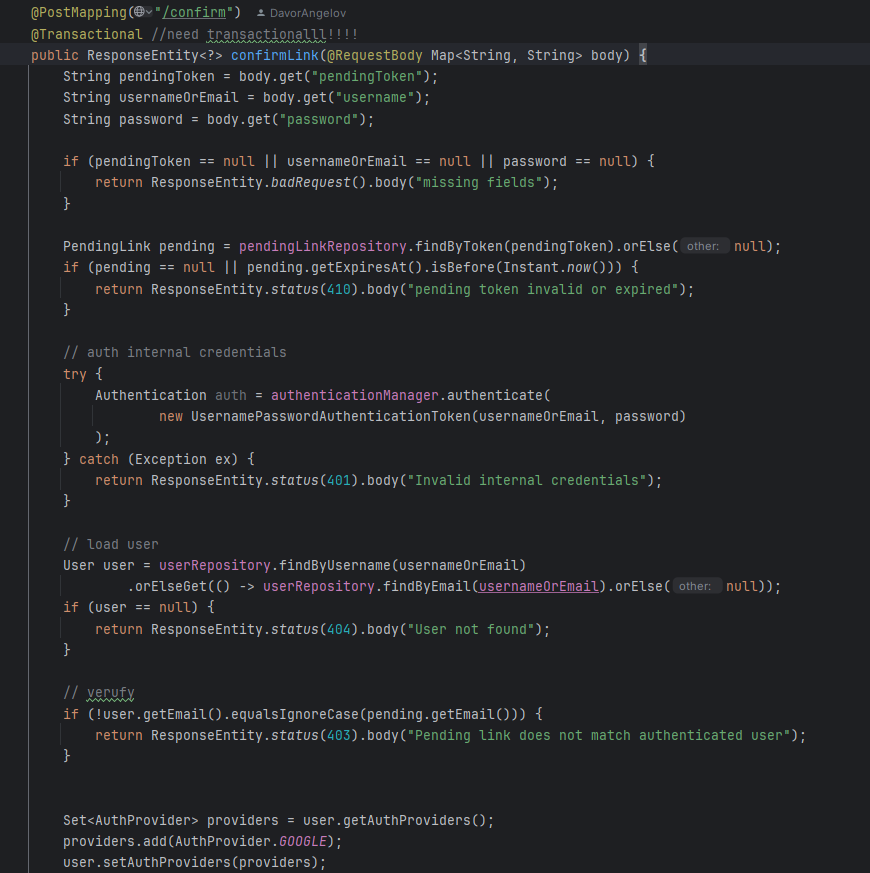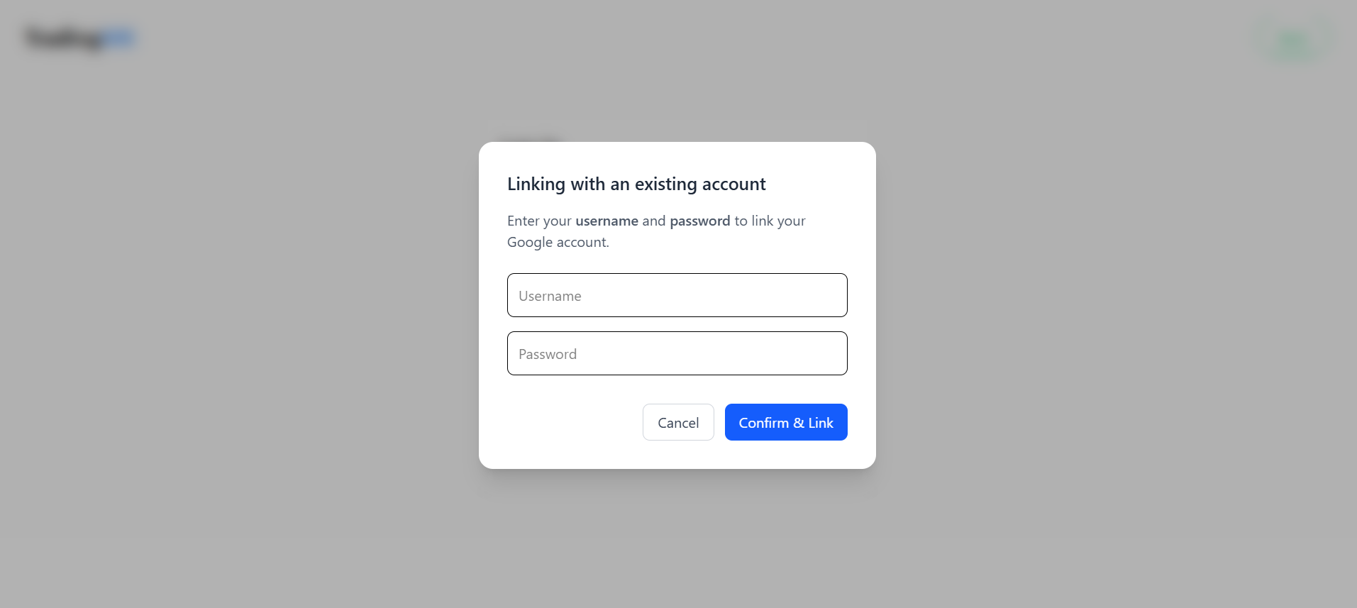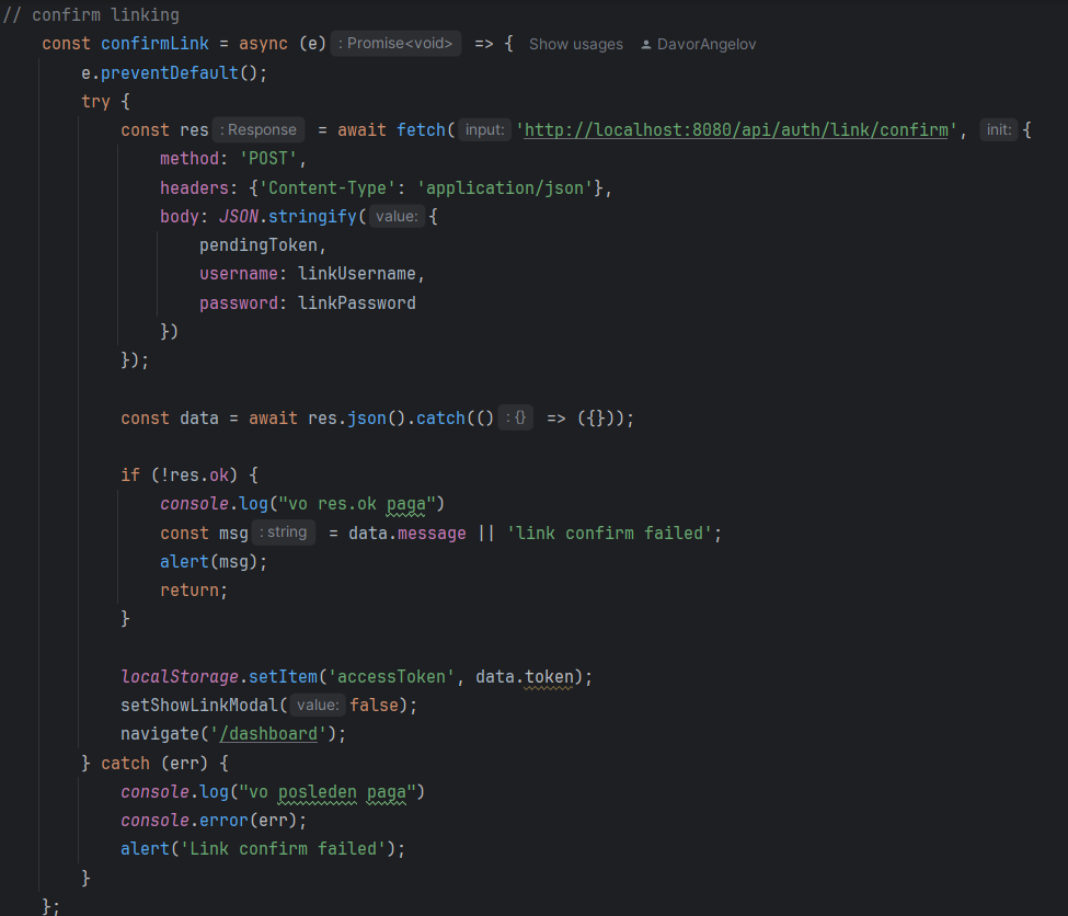 Ако backend врати 409, се чува pendingToken и се отвора modal за поврзување со internal account.