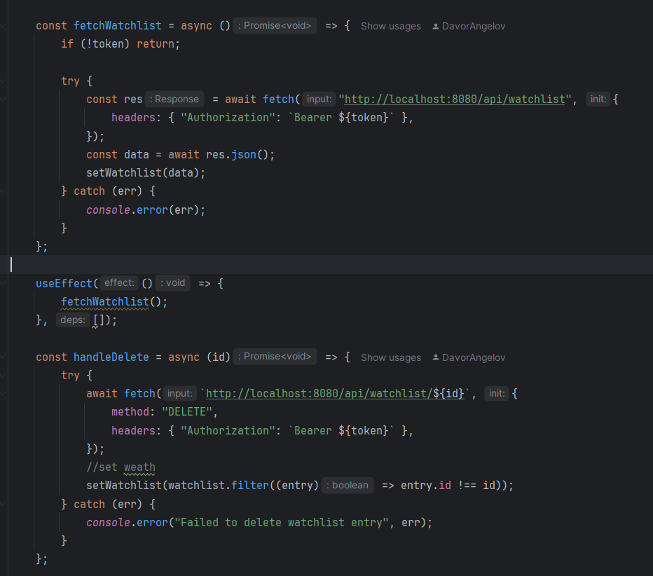 Frontend праќа GET request до /api/watchlist со Authorization header (JWT), POST request до /api/watchlist за додавање нов entry, DELETE request до /api/watchlist/{id} за бришење.