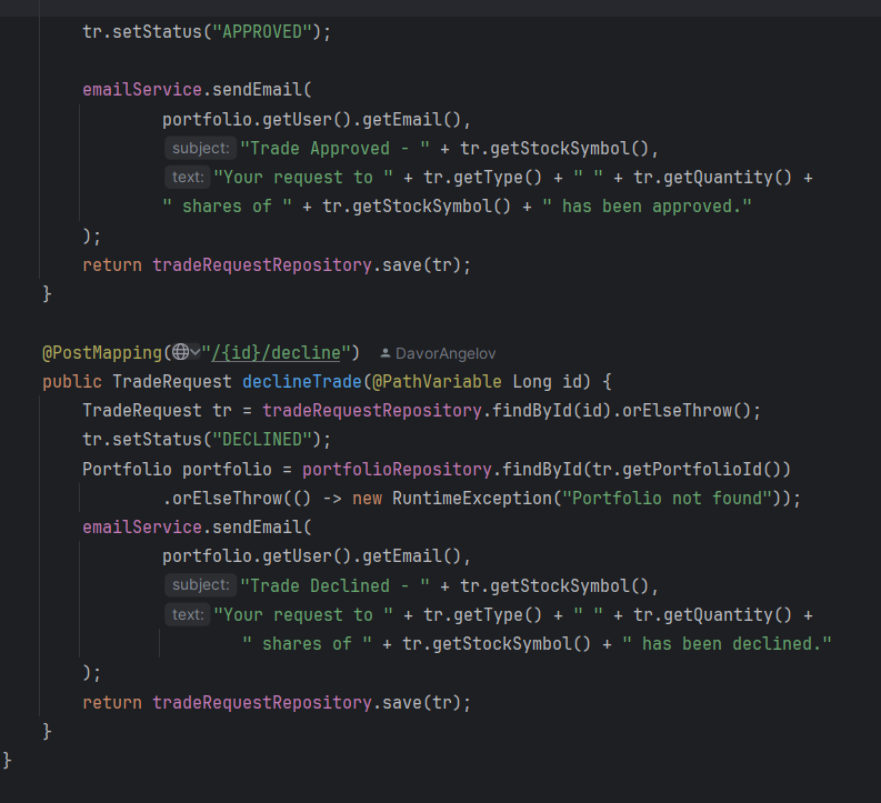 Mail се праќа со истата логика и кога админ/брокер, ќе одобри/одбие tradeRequest.