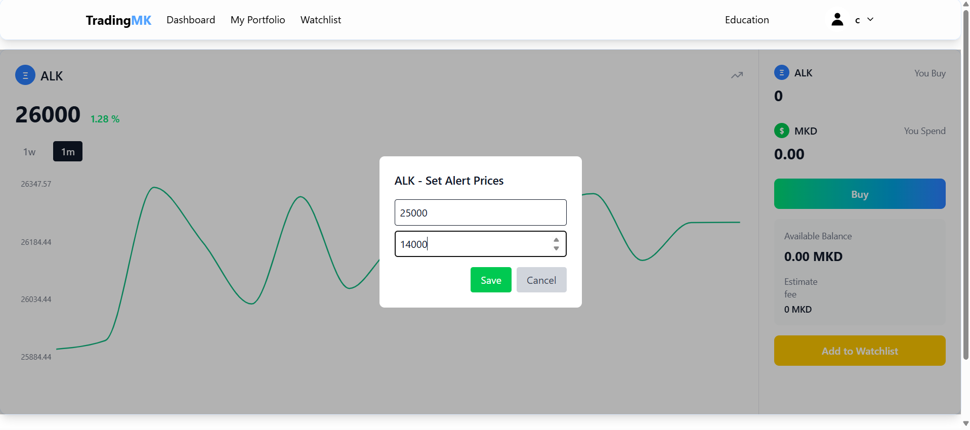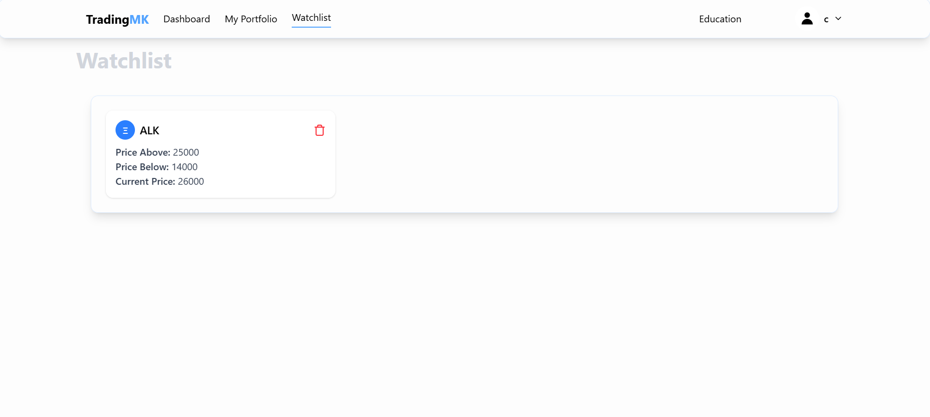 Корисникот има достапен Watchlist, прикажува листа на акции кои се следат, Има Trash icon за бришење на акција, може да додава нова акција (Price Above / Price Below).