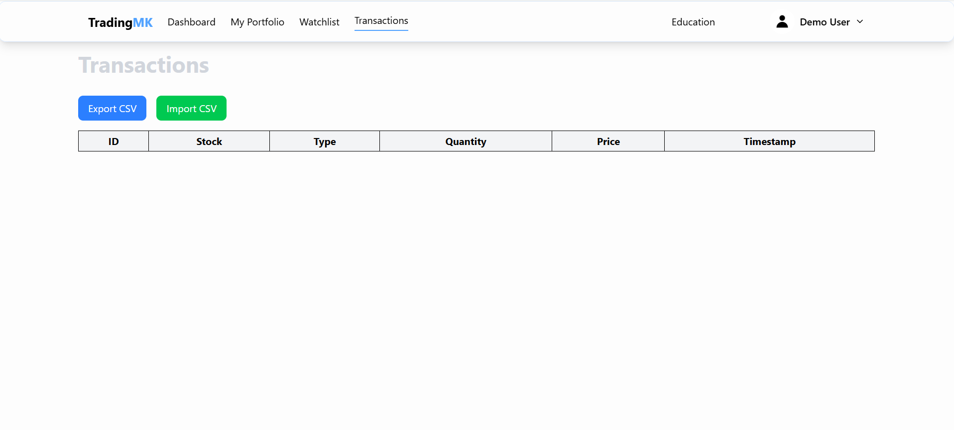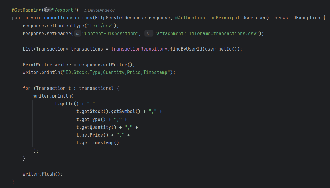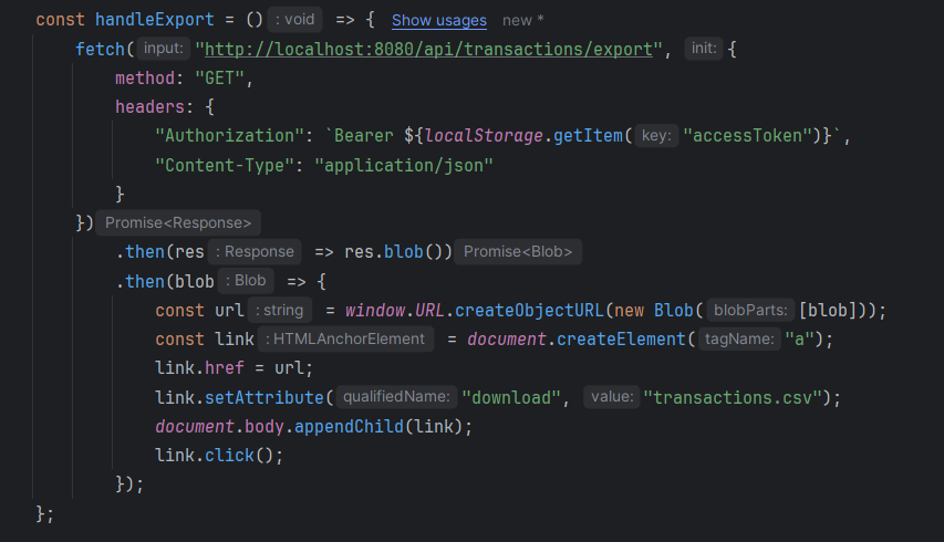 Кога ќе се кликне на export, се прави GET request до backend endpoint /api/transactions/export. Фајлот се симнува автоматски на корисникот.