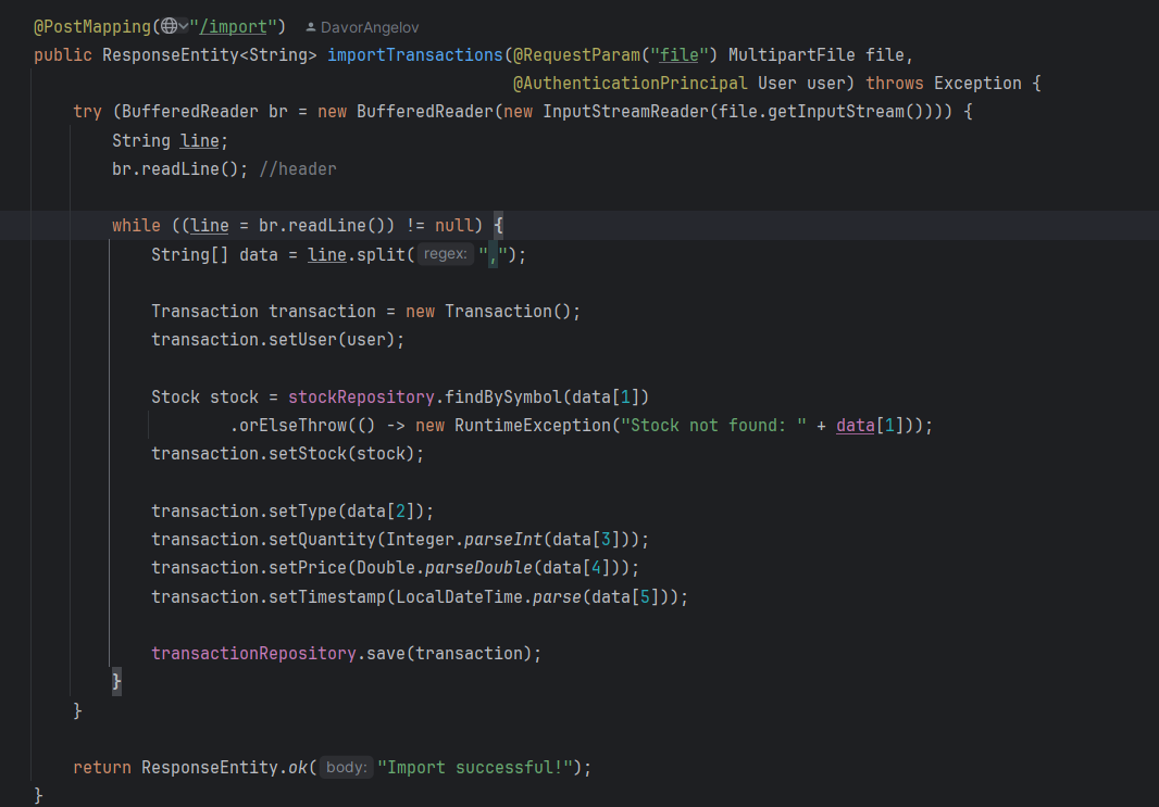 Endpoint /api/transactions/import прима CSV фајл (@RequestPart("file") MultipartFile file) и ги парсира редовите. При import на трансакции се запишува во базата како EXTERNAL, поради сигурносни причини.