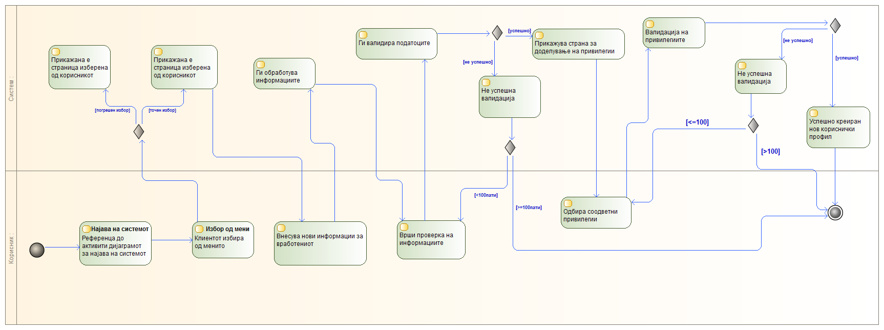 - Системот ги валидира внесените привилегии и го известува администраторот за успешноста на крерањето на новиот кориснички профил со доделените привилегии.