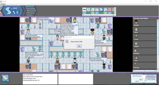 Anne и Correy ги вработив бидејќи комбинирано имаат Project Management skills и Requirements skills. Им дадов задача Meet with customer for requirements. Првата итерација заврши со пронајдени 20 use cases и на 62 tick со 49.600 долари потрошени. Наредна итерација на двајцата им зададов задача да направат assessment на Inception phase, тоа заврши на 108 tick со 86.400 долари потрошени. Потоа им зададов задача да направат план за Elaboration phase, тоа заврши на 148 tick, со 118.400 потрошени долари, што е под буџетот предвиден за Inception phase.