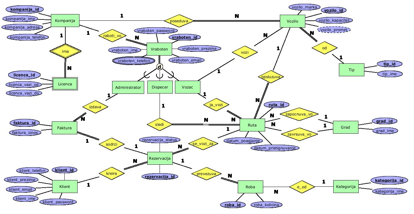 - poseduva - 1:N релација меѓу Компанија и Возило(со тотално учество од страната на ентитетот Возило) која означува дека една компанија може да има повеќе возила и едно возило мора да припаѓа на една компанија