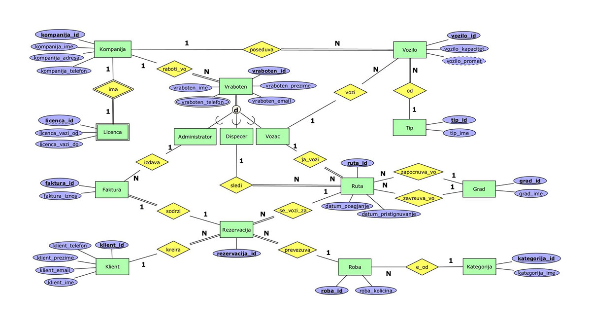 - poseduva - 1:N релација меѓу Компанија и Возило(со тотално учество од страната на ентитетот Возило) која означува дека една компанија може да има повеќе возила и едно возило мора да припаѓа на една компанија