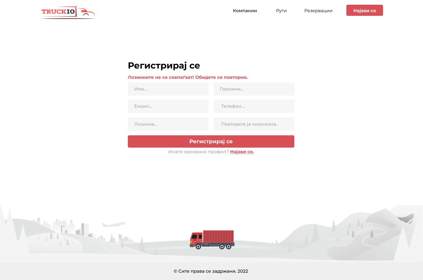 Доколку се појави грешка во повторувањето на лозинките во делот за регистрација, се појавува порака за грешка