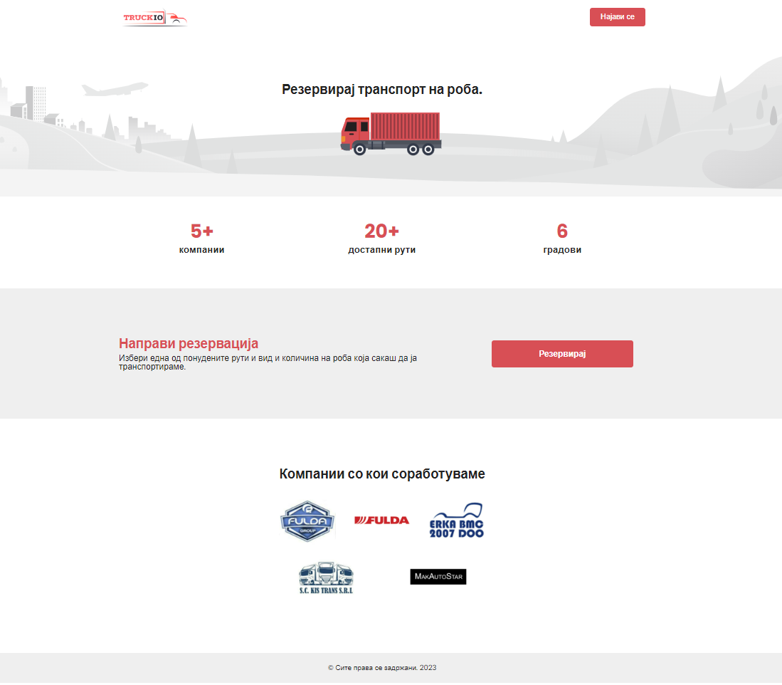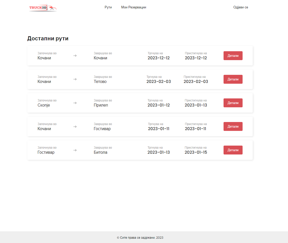 Откако ќе бидат внесени соодветни податоци, при клик на Регистрирај се, се редиректира клиентот кон екранот за најава, како на сликата погоре. По успешно највување на корисникот му се прикажува екран за достапни рути кои ги нудат компаниите од нашата апликација. На екранот има копчиња Рути, Мои Резервации и Одјави се.