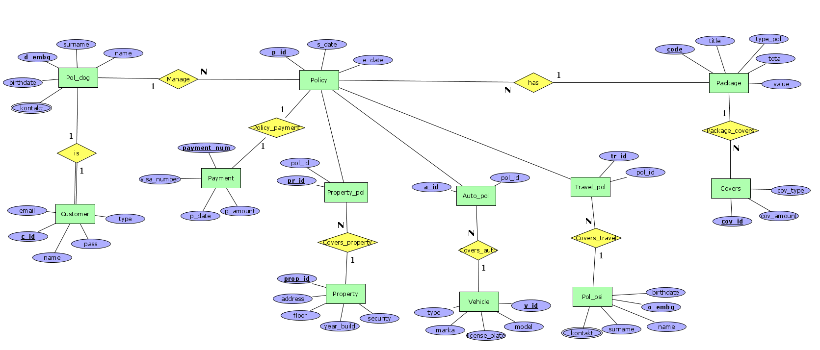 - is - претсавува 1:1 релација помеѓу Customer и Pol_dog каде што еден клиент може да биде само еден пат како договарач.
