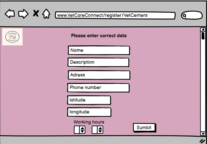 Корисникот ја одбира опцијата за регистрација на ветеринарен центар. Се отвара нова страна за регистрација на ветеринарен центар.