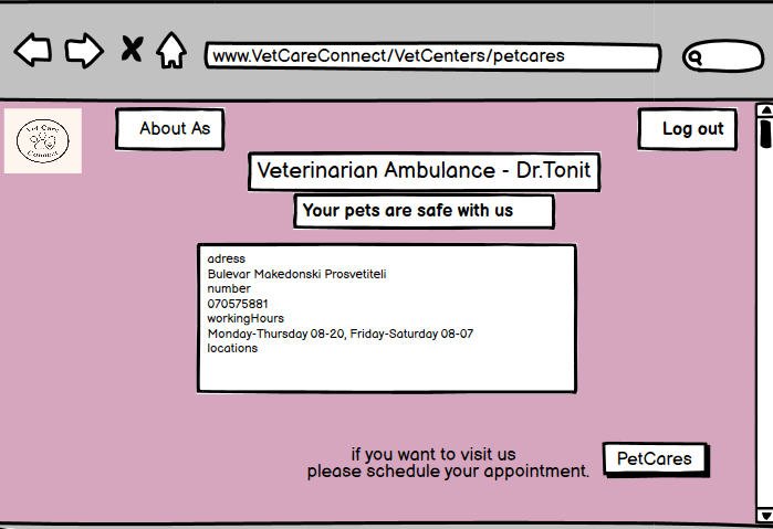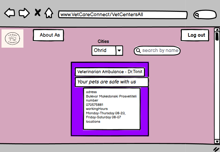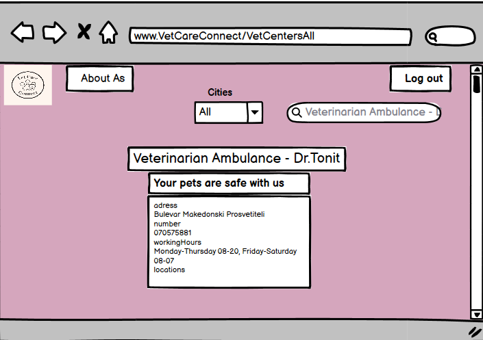Корисникот одбира еден град. Му се прикажуваат ветеринарните центри во тој град. Корисникот клика на одреден ветеринарен центар.