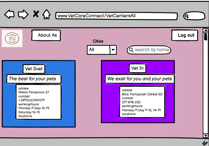 Се отвара нова страна на која што корисникот има опција да ги филтрира ветeринарните центри по градови, како и да пребарува по име на ветеринарен центар.