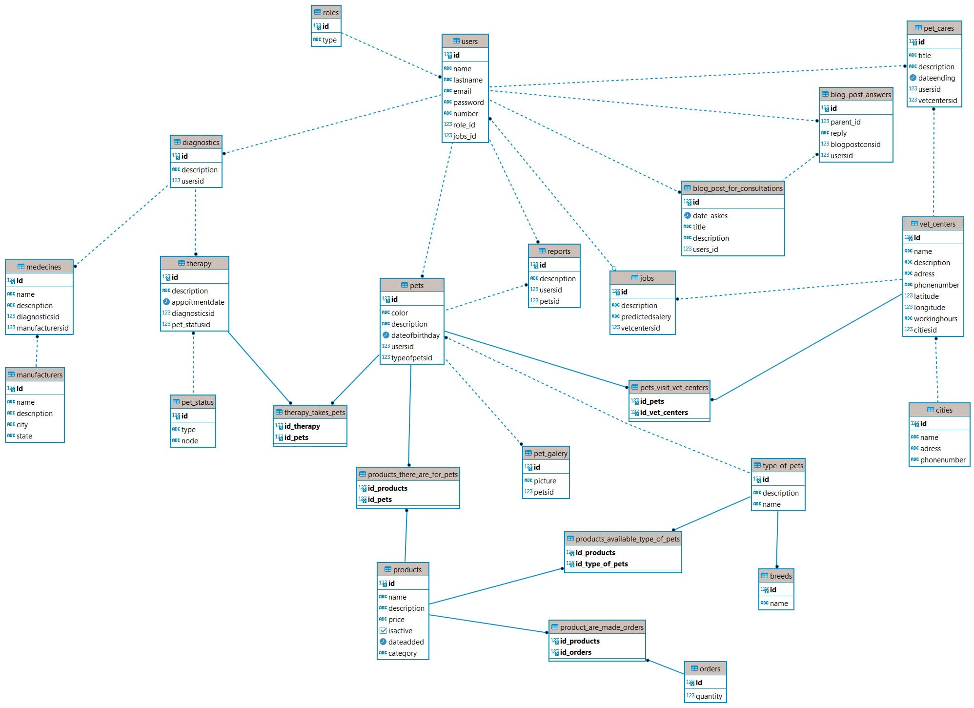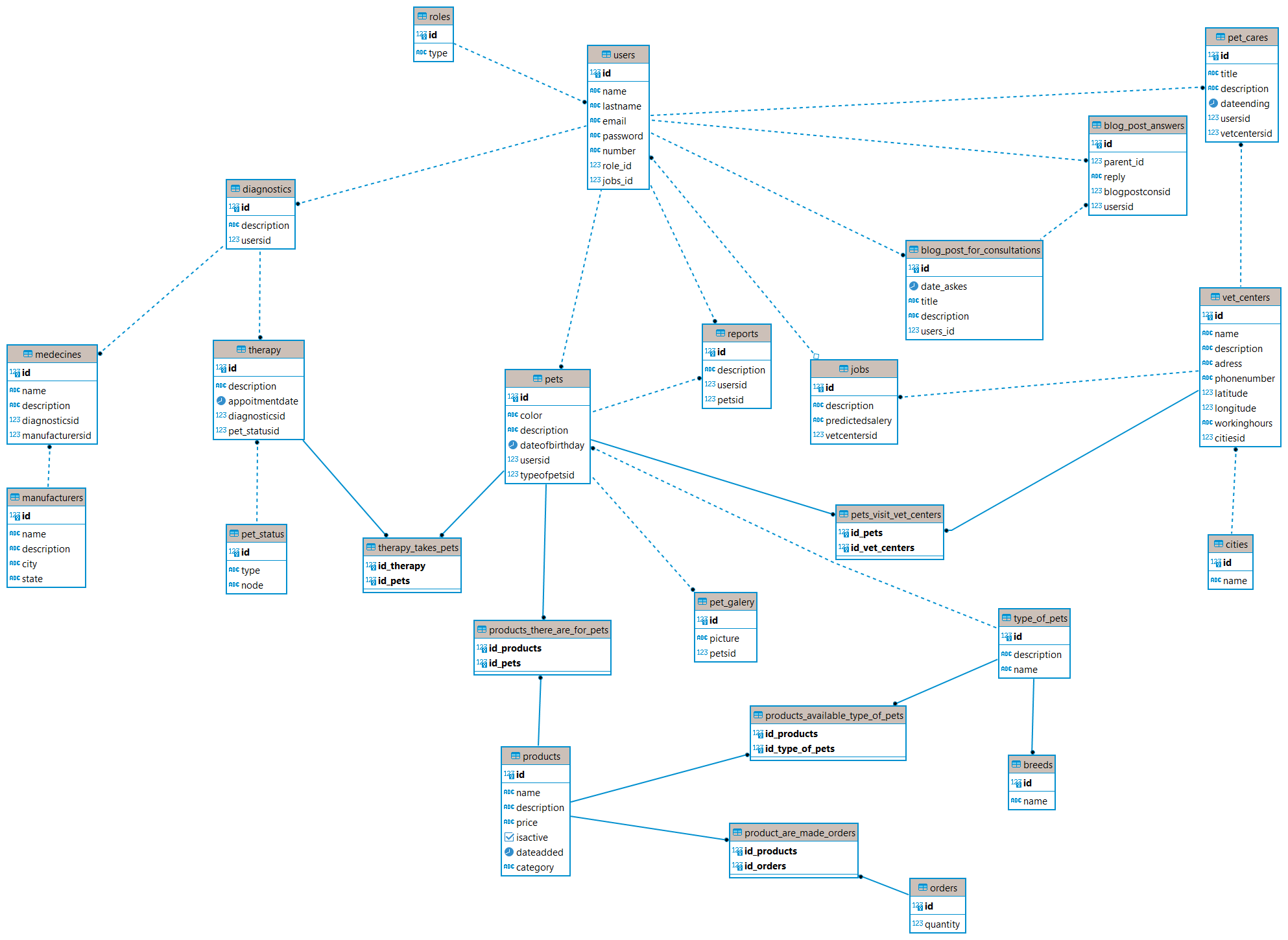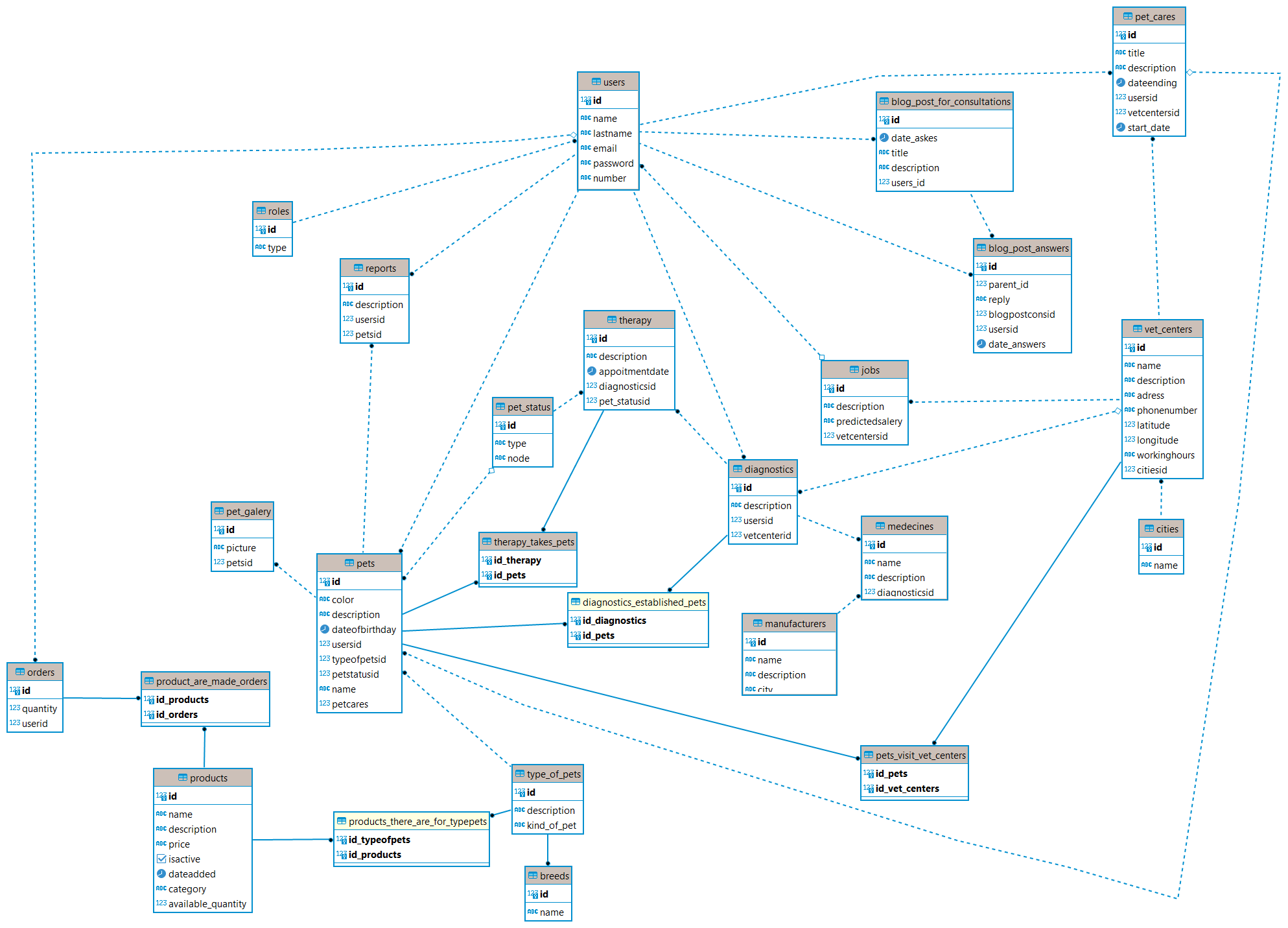 - Pets (id, color, description, dateofbirthday, usersid*, typeofpetsid@, petstatusid%, name, petcares&)