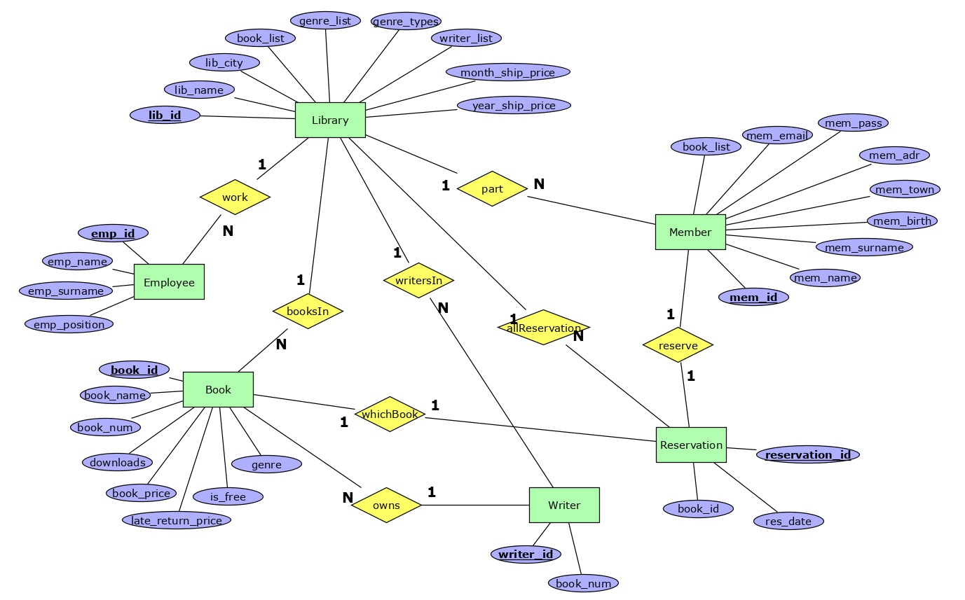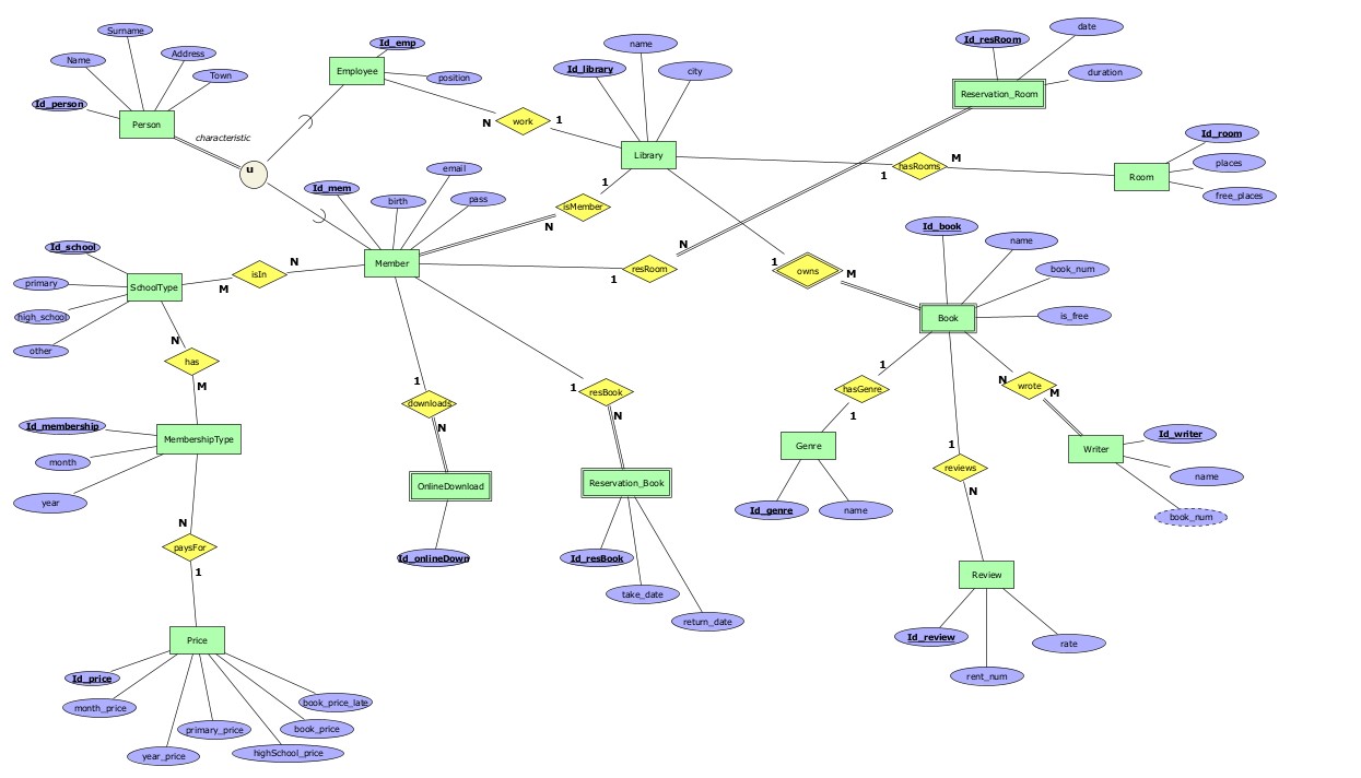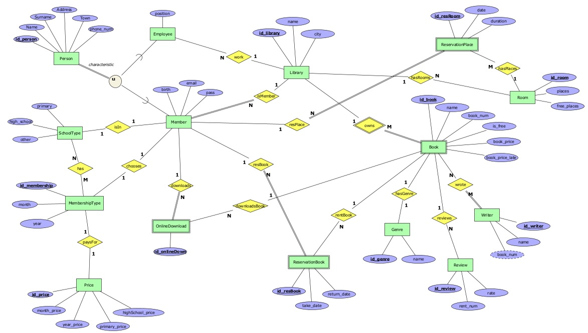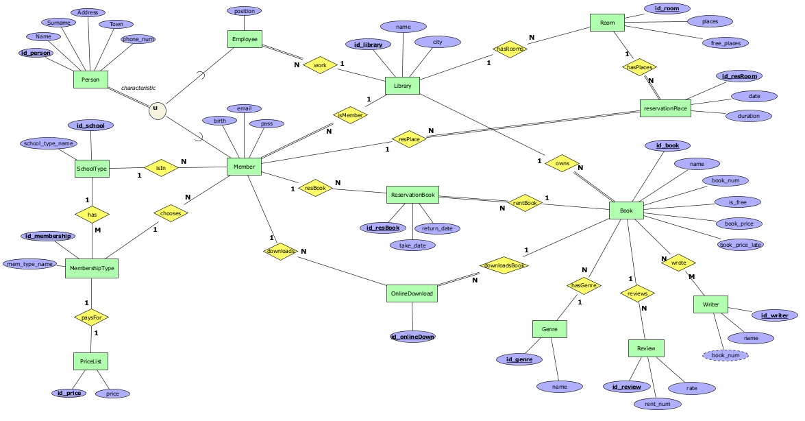 - wrote – оваа релација ги поврзува ентитетите Book и Writer, и означува дека една книга може да има повеќе писатели, и дека повеќе писатели може да имаат напишано една книга. Writer има тотално учество во оваа врска, бидејќи една книга не може да нема писател.