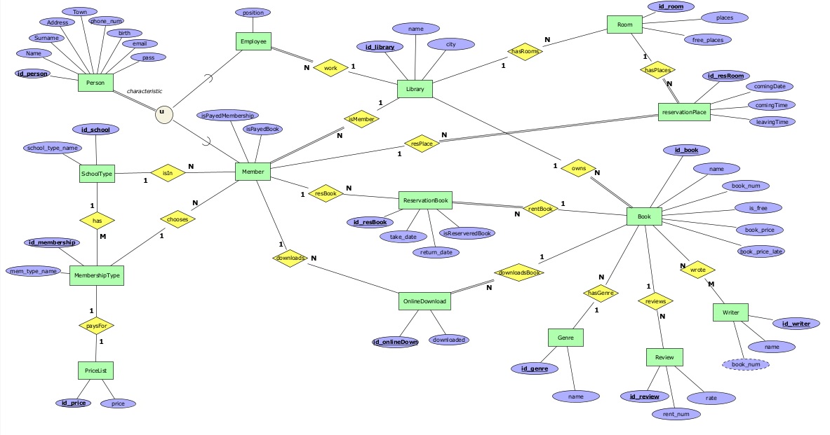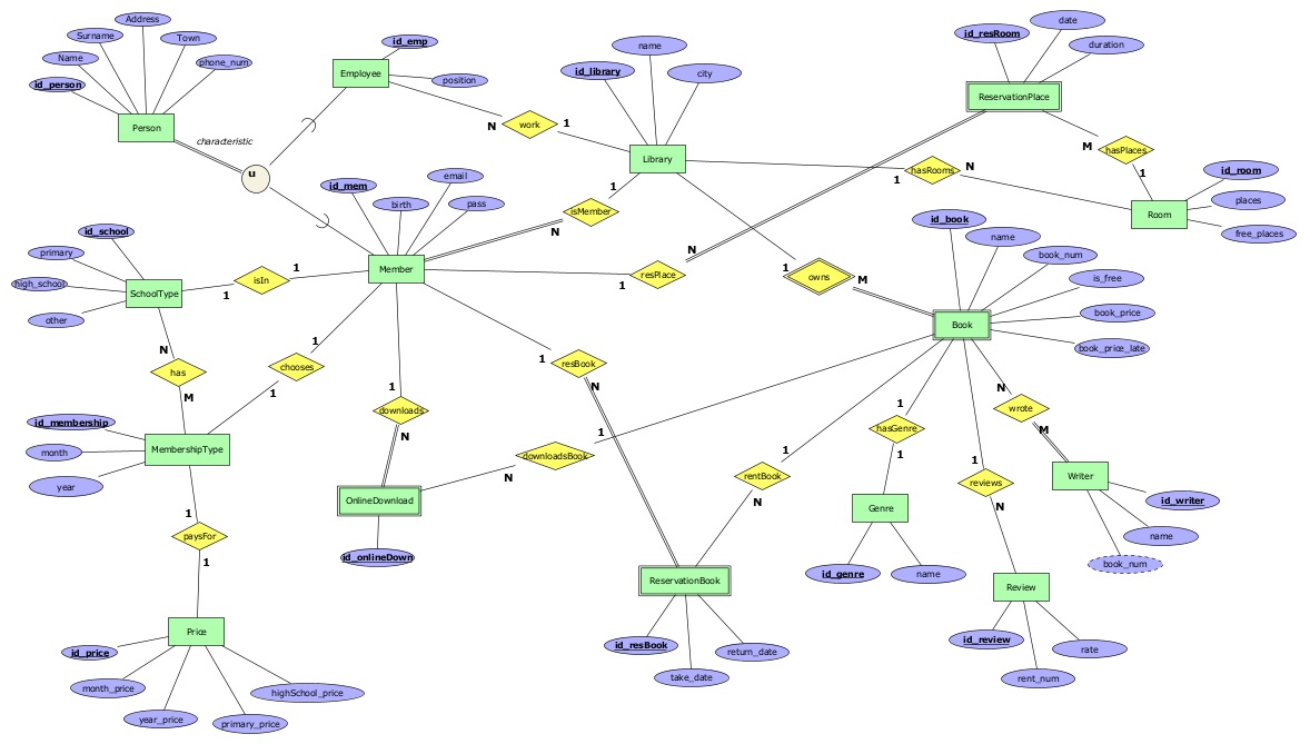 - isMember - оваа релација ги поврзува ентитетите Library и Member, и означува дека во една библиотека членуваат повеќе луѓе. Member има тотално учество бидејќи во членувањето во библиотеката.