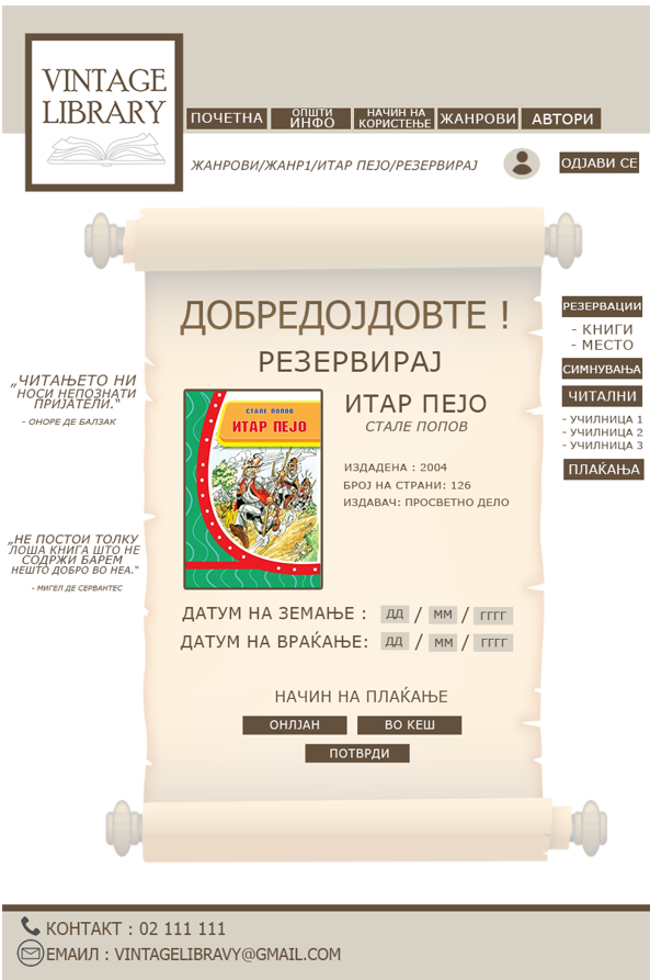 5. По изборот на посакуваната книга, клика на копчето за резервацијата, и ги пополнува потребните информации.