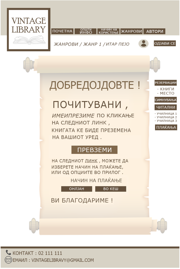 5. По изборот на посакуваната книга, клика на копчето за симнување и се редиректира на страница на која треба да го потврди симнувањето и да избере начин на плаќање.