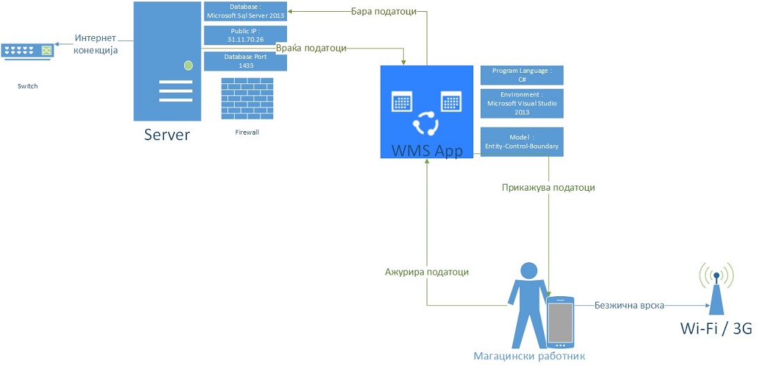 Централизираната база на системот ќе биде поставена на сервер и на неа ќе може да пристапуваат магацинските работници преку претходно најавување на своите ПДА уреди,