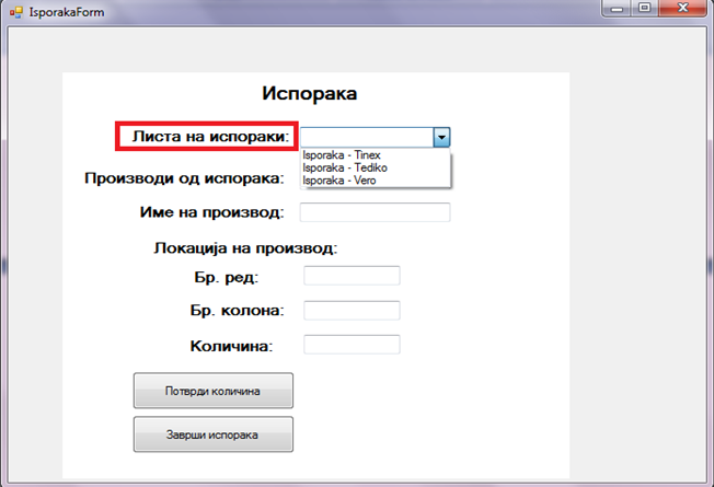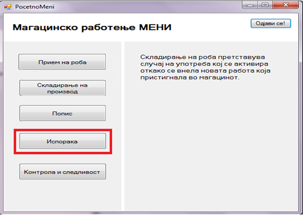 - Се појавува менито со функционалностите кои ги извршува магацинскиот работник. Се избира една функционалност , во случајов Испорака