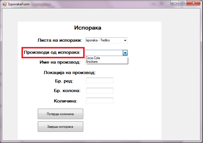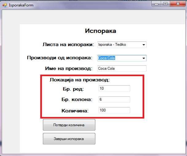 - Магацинскиот работник за секој производ од листата на производи ја потврдува количината која ја спрема за испорака преку копчето Потврди количина. Откако ќе ја потврди количината за сите производи и ќе ја спреми испораката клика на копчето Заврши испорака со што се комплетира испораката и се ажурираат сите податоци во врска со количината на производите кои се испорачуваат.