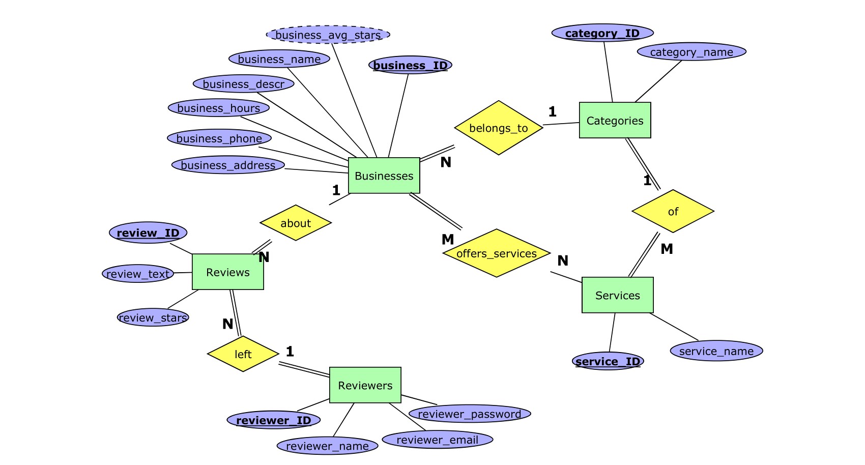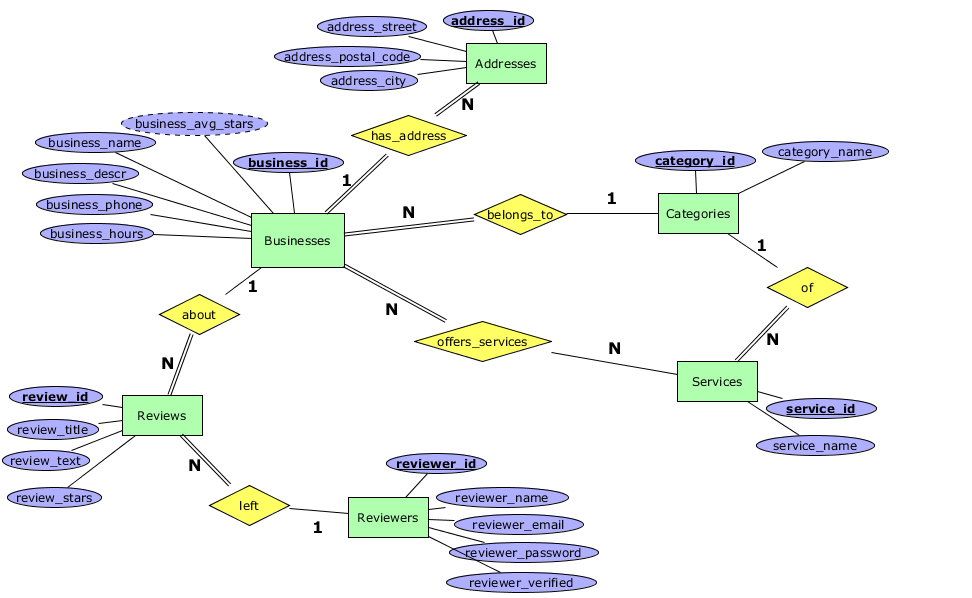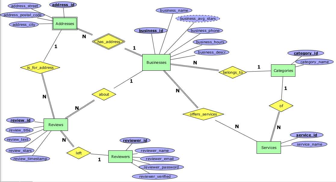- Четврта верзија: додаден слаб ентитет Addresses, кој е во релација со Businesses и Reviews за овозможување ист бизнис на повеќе адреси како и ревју кој се однесува за биснис на одредена локација. Додаден review_title атрибут во ентитетот Reviews. Додаден булеан атрибут reviewer_verified во ентитетот Reviewers, кој укажува на тоа дали дадениот ревјуер е верификуван.