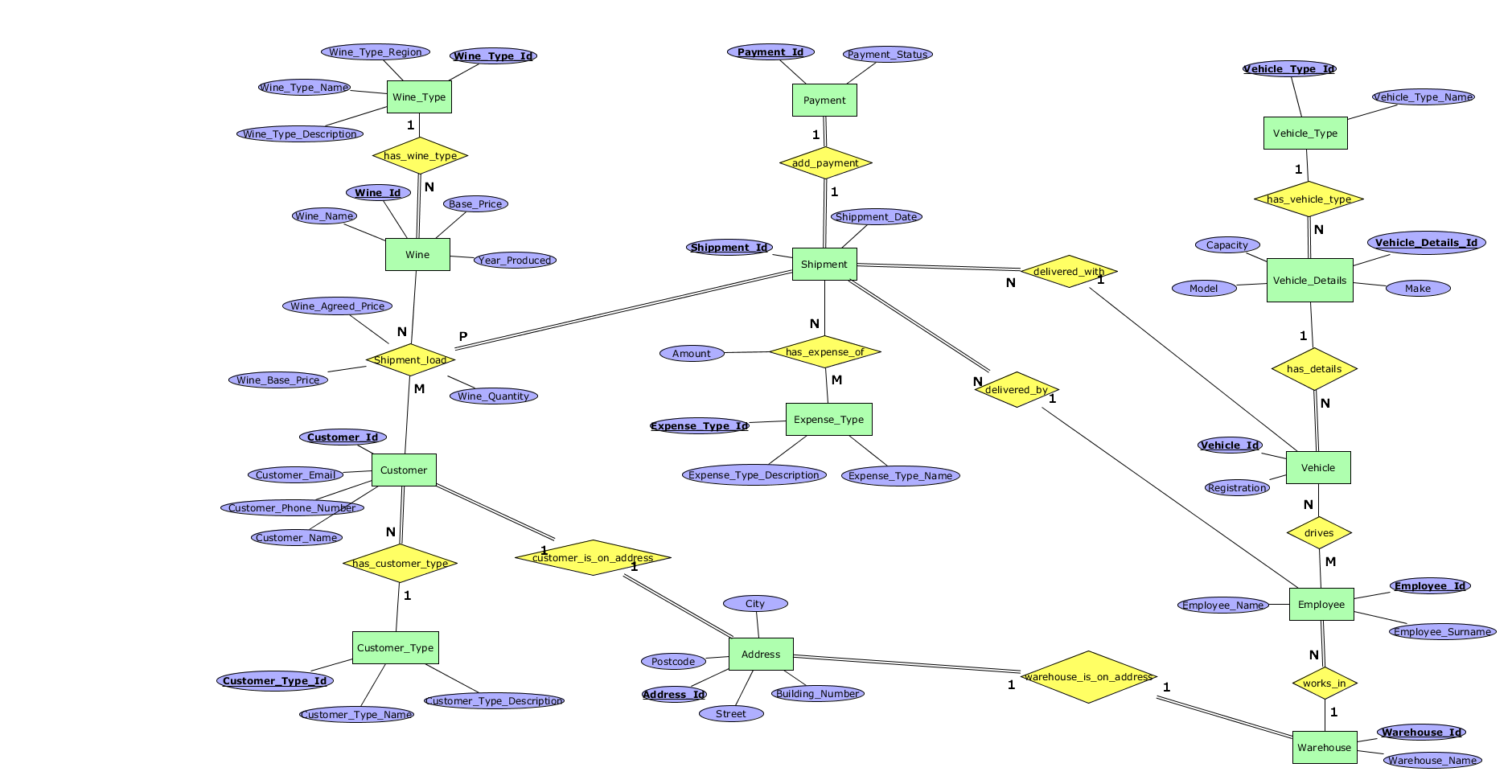 - shipment_load - N:M:P релација помеѓу Shipment, Wine и Customer каде што секоја пратка мора да има товар за некој клиент и вино.