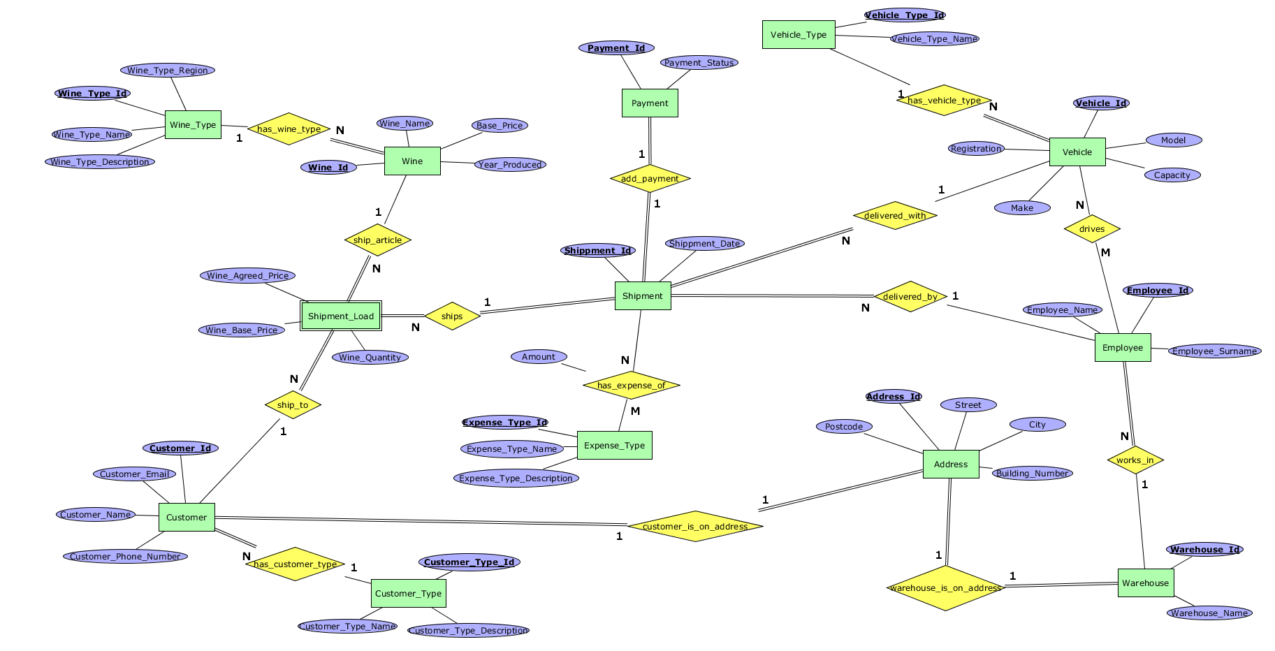 - ship_article - 1:N релација помеѓу Wine и Load каде што секој товар мора да содржи вино.