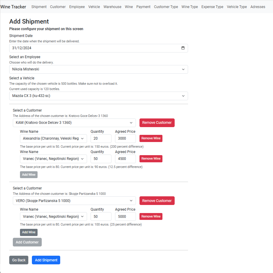 - Приказ на форма за додавање со популирани листи од Вработени, Возила за вработениот, Клиенти и Вина