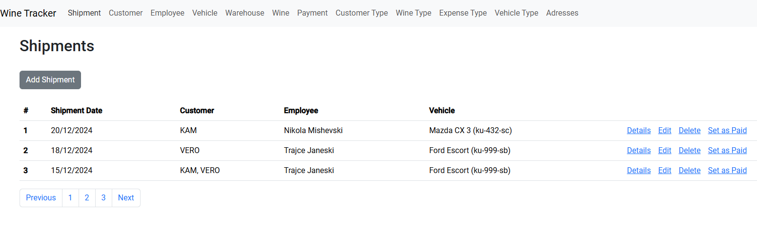 - Магационерот внесува податоци за доставата (на кој клиент кое вино и по која цена, кој вработен и со кое возило ке врши достава) и клика Додади