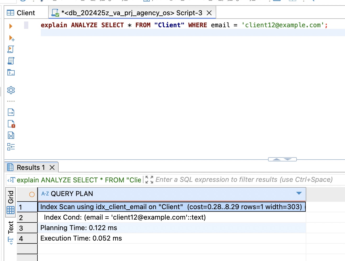 Index Scan using idx_client_email on "Client" (cost=0.28..8.29 rows=1 width=303) Index Cond: (email = 'client12@example.com'::text)