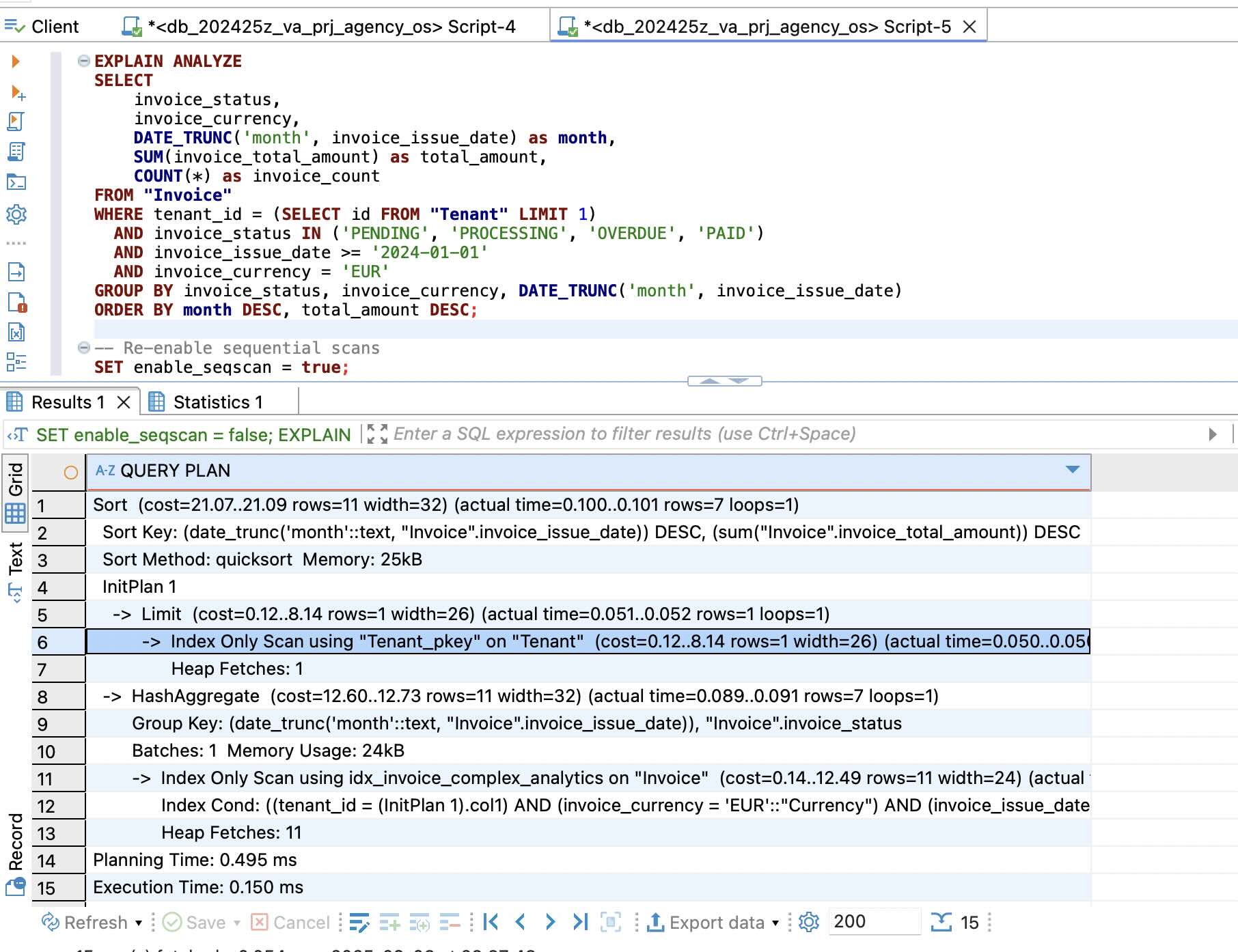 Index Only Scan using idx_invoice_complex_analytics on "Invoice" (cost=0.14..12.49 rows=11 width=24) Index Cond: ((tenant_id = 'tenant_123') AND (invoice_currency = 'EUR'::"Currency") AND (invoice_issue_date >= '2024-01-01 00:00:00'::timestamp without time zone)) Heap Fetches: 11