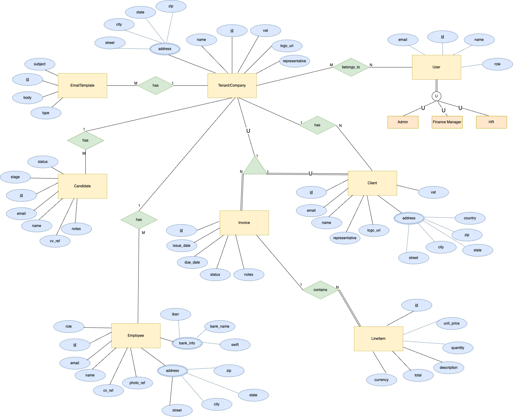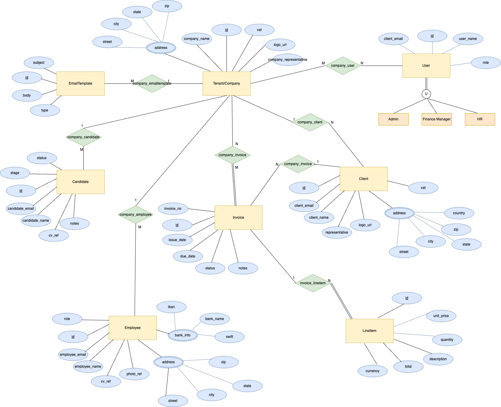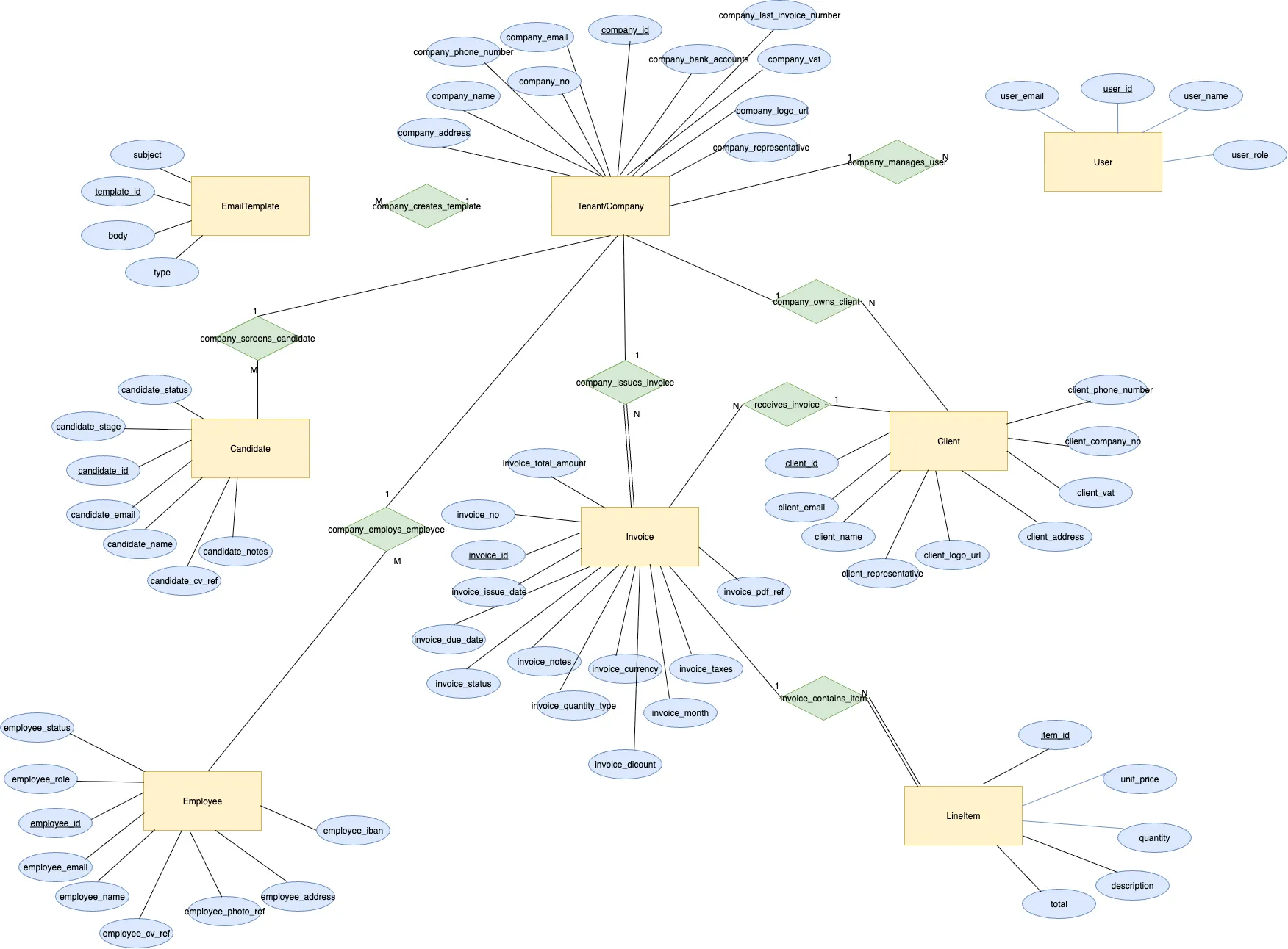 - Company ↔ Invoice (company_issues_invoice): A company generates many invoices; each invoice belongs to one company.