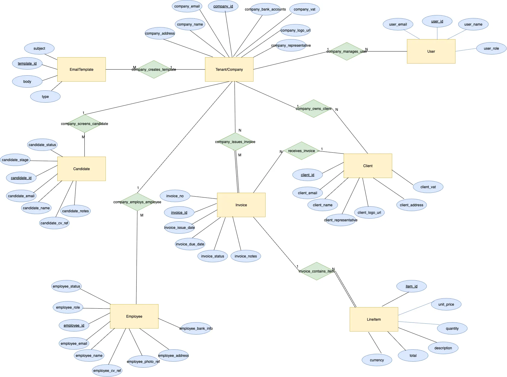 - Company ↔ EmailTemplate (company_creates_template): A company has multiple email templates; each template belongs to one company.