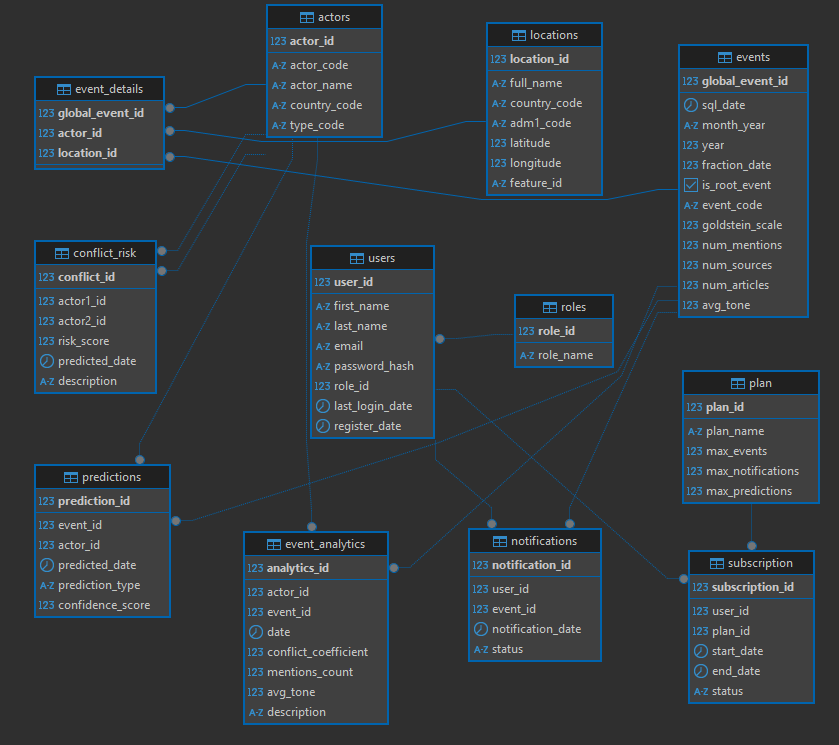 CONFLICT_RISK(Conflict_Id*, Actor1_Id*, Actor2_Id*, Risk_Score, Predicted_Date, Description)