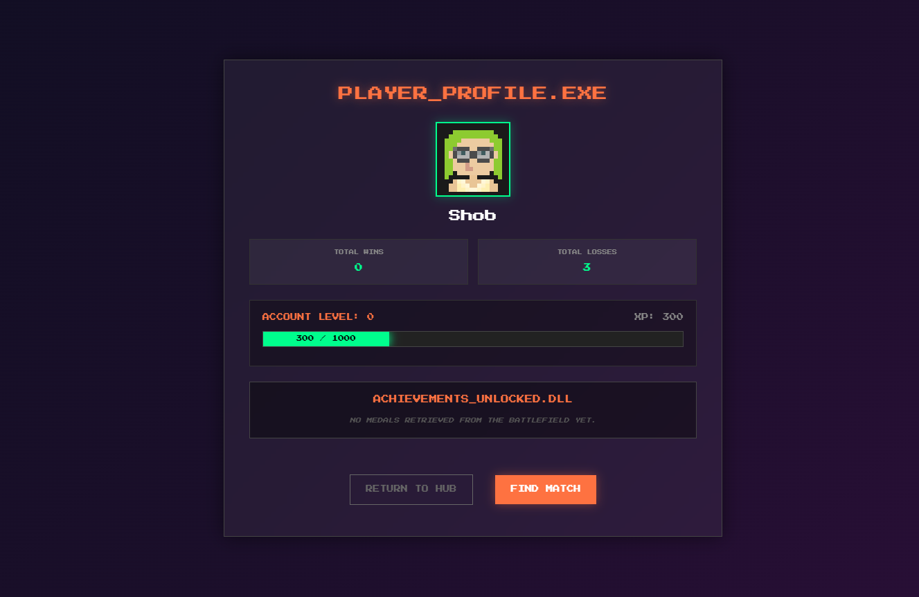 На страницата за профил, корисникот има увид во својата лична статистика, вклучувајќи победи, порази и моментален добиени Achievements. Achievements се добиваат со одреден број на поени преку играње.