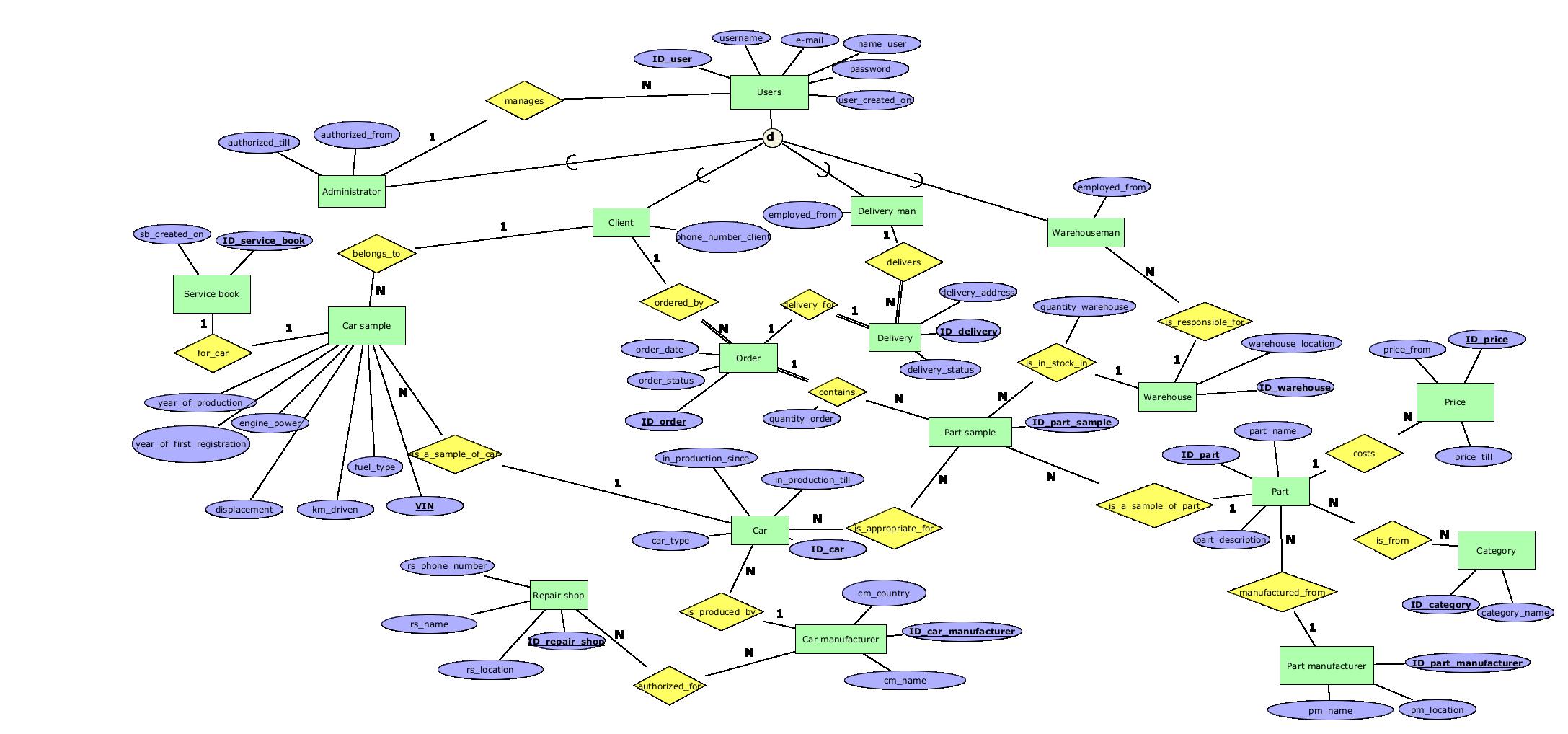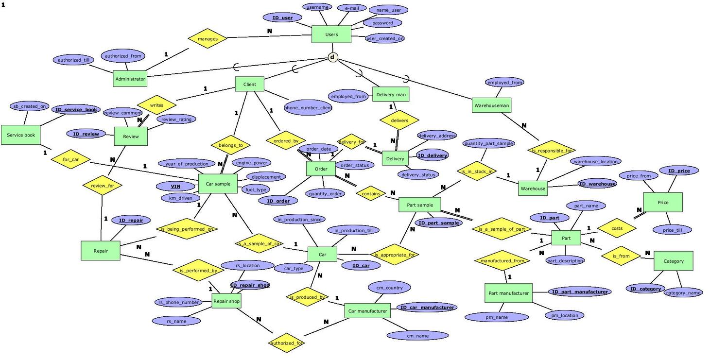 - is_a_sample_of_car - 1:N релација помеѓу Car sample и Car каде што се чува одредениот примерок од колата што го поседува клиентот