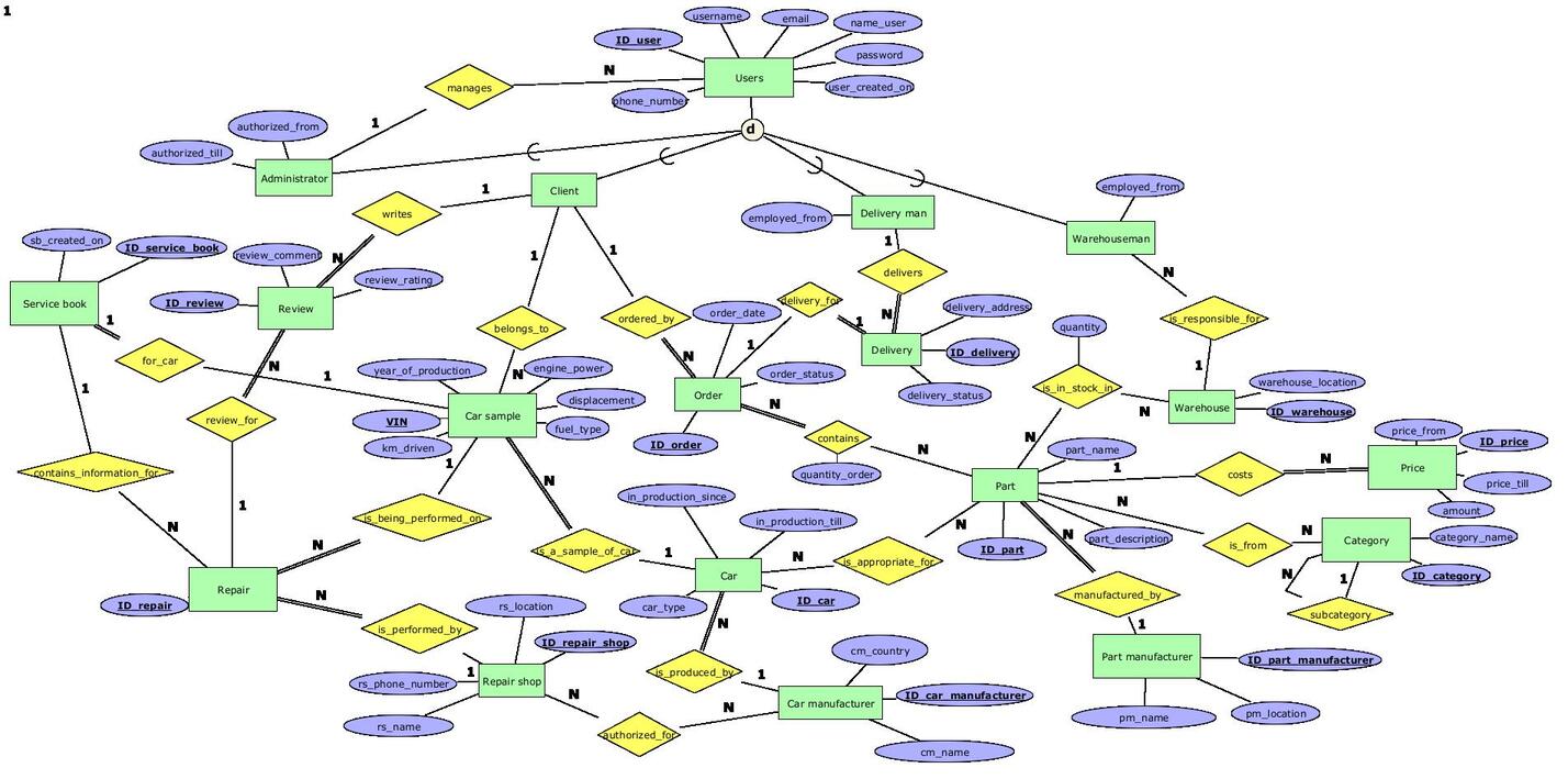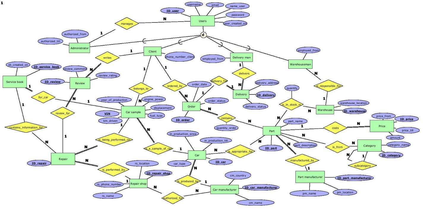 - contains_information_for - 1:N релација помеѓу Service book и Repair каде што се чува во service book кои поправки се правени врз некој автомобил