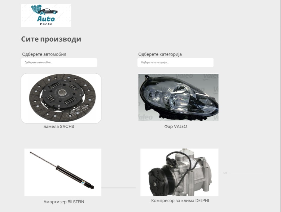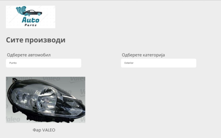 Корисникот одбира соодветно тип на кола за која што сака да му се појават делови, како и категорија на делови и соодветно му се прикажуваат резултати