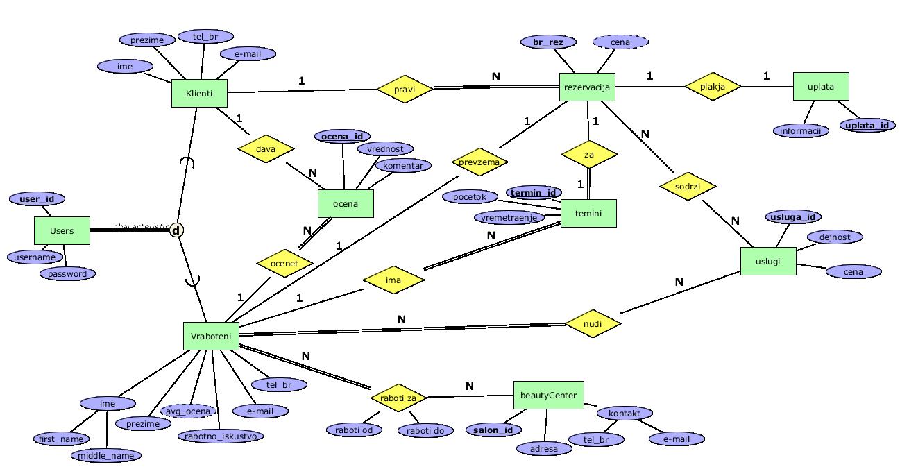 Веб платформа за закажување термин во салон за убавина која ќе биде достапна во целата држава. Клиентите ќе може да се регистрираат на сајтот и за нив ќе се чуваат податоци за име,презиме,телефонски број, е-адреса и број на резервации. Со најавување на страната добиваат можност да резервираат термин за некоја услуга која ја нуди салонот, како и можност да оценат некоја од услугите за идните корисници да имаат дополнителни информации. За вработените ќе се чува име, презиме,работно искуство(во години), телефонски број и е-адреса. За закажаниот термин ќе се чува број на резервација, цена, клиент,вработен и термин.