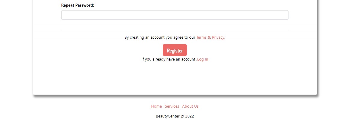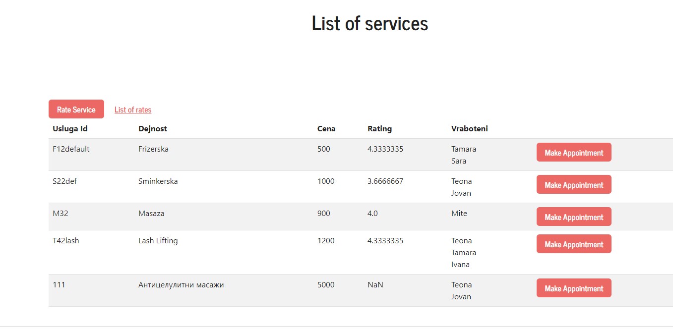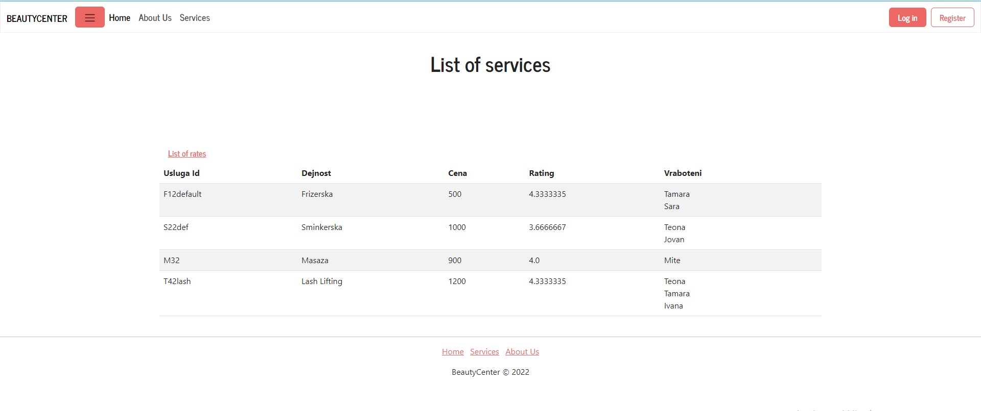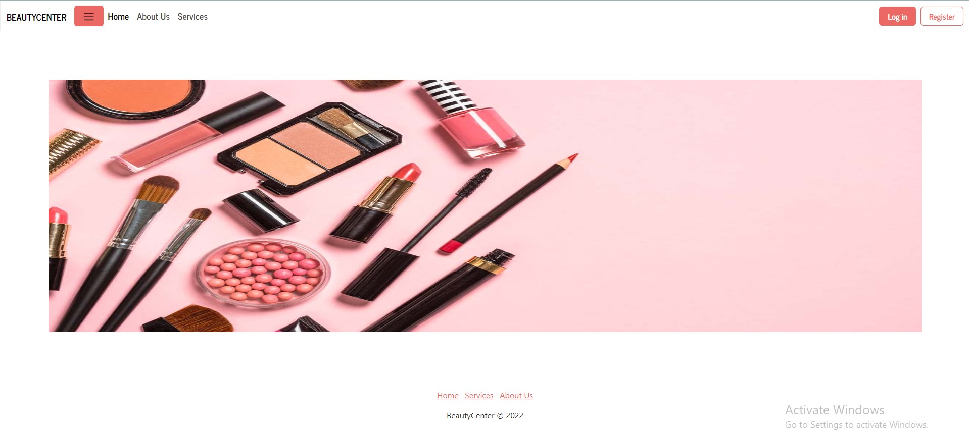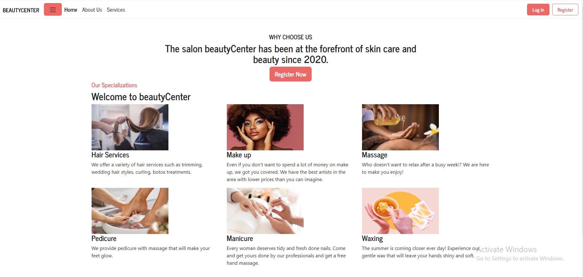 На почетната страница се достапни 3 копчиња кои се следните: home - на кое што се прикажува почетната страница со неколку фотографии од салонот, about us - се прикажуваат картички со достапните сервиси и има копче чиј што клик пренасочува кон регистрација и services - каде што се листаат детално сите сервиси и кој од вработените ги извршува истите.