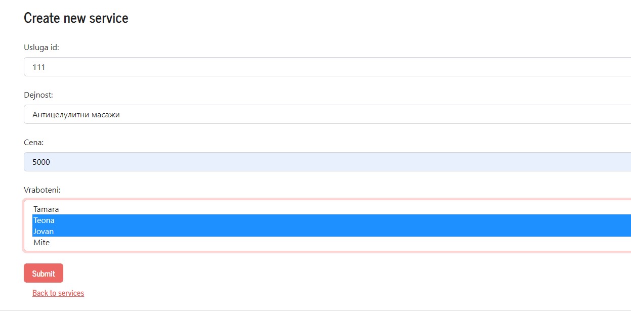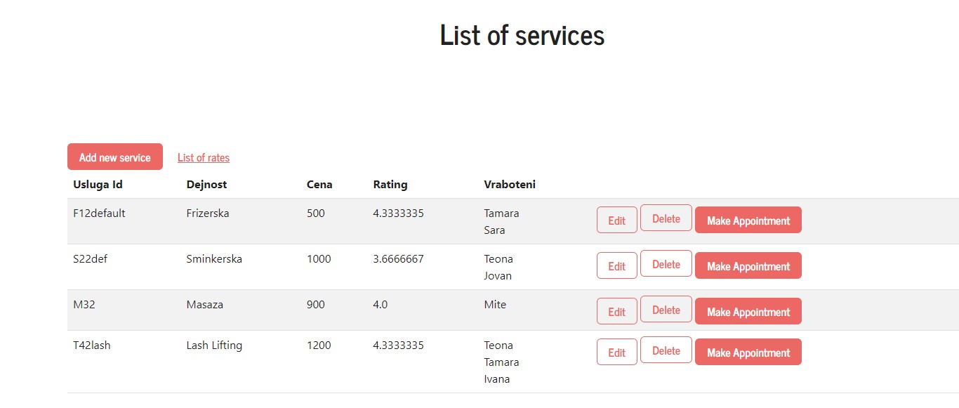 При отварањето на страната со сервисите има копче кое овозможува додавање нов сервис (само од страна на вработен) и истиот потоа може да се менува или брише.
