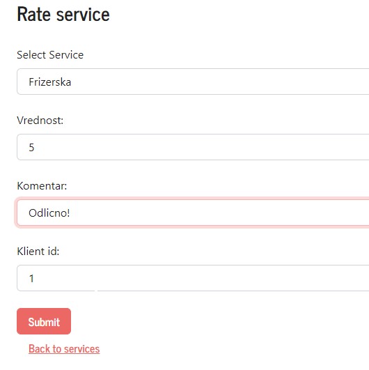Со клик на копчето Направи резервација се отвара страната за резервирање каде клиентот бира термин, сервис и метод на плаќање. По клик на копчето Submit, се редиректира на страната Резервации на која се листаат сите досегашни резервации на клиентот во салонот. Истите тој може да ги едитира или брише во секое време.