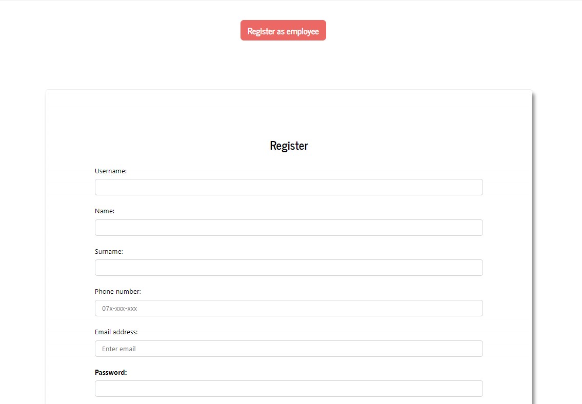 При клик на копчето за регистрација се појавува формата за регистрација која е предефинирана за клиент но со клик на копчето "Регистрирај се како вработен" внесените креденцијали се внесуваат во базата и се пренасочува кон страната за најава.
