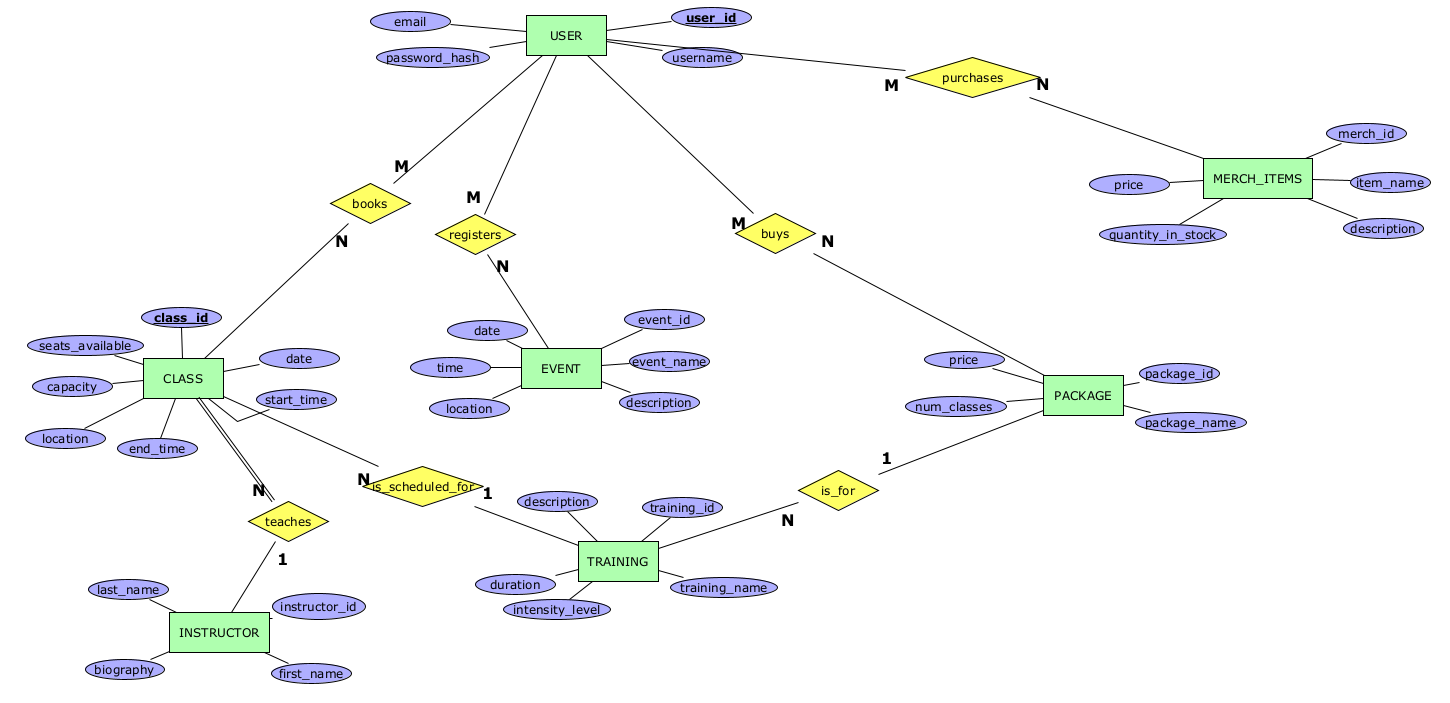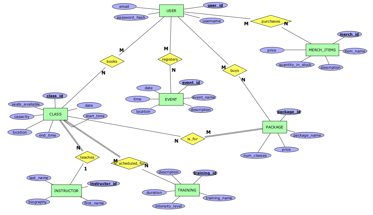 - is_scheduled_for (CLASS ↔ TRAINING, M:N) Еден час може да содржи повеќе (најмалку еден) тренинзи, а еден тренинг може да се појави во повеќе часови или воопшто да не биде закажан.