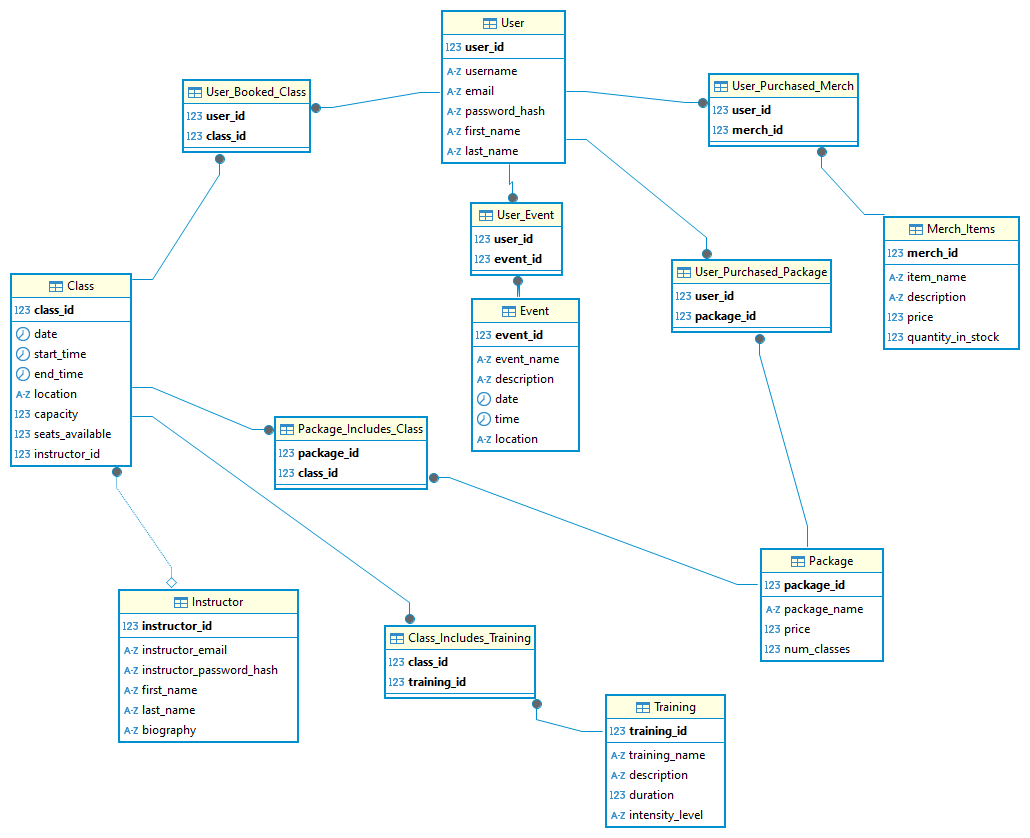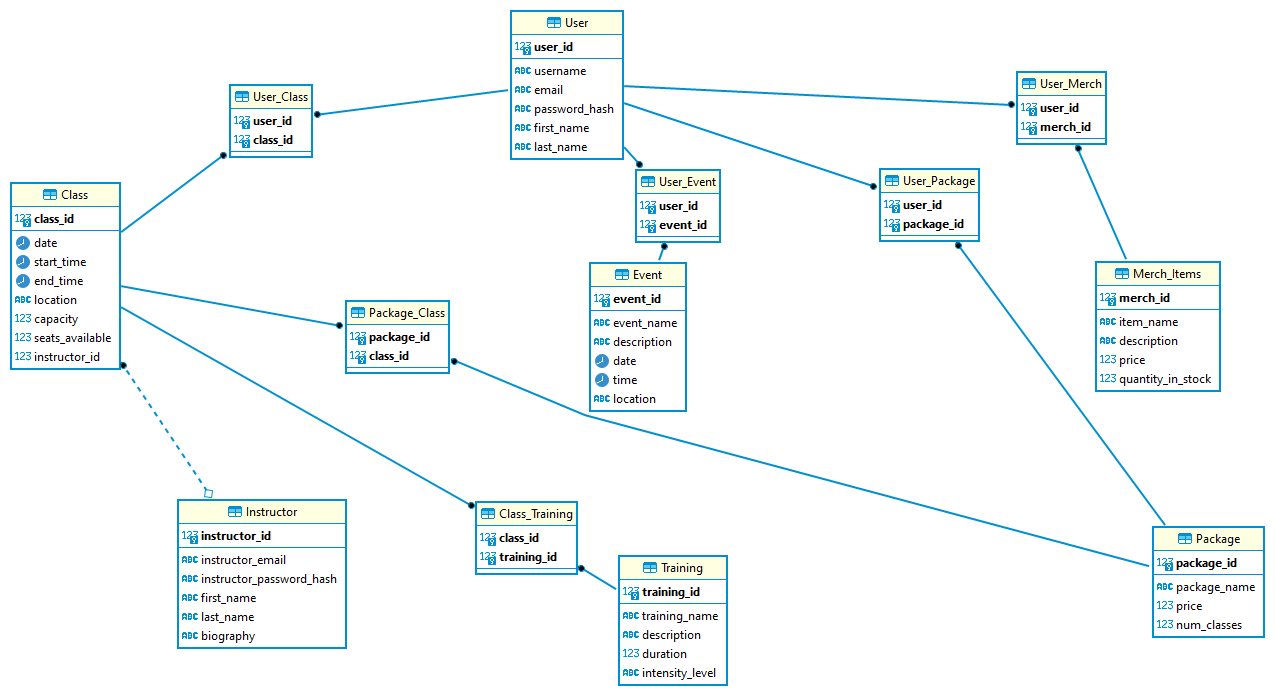 - User_Booked_Class ( user_id*, class_id* )
