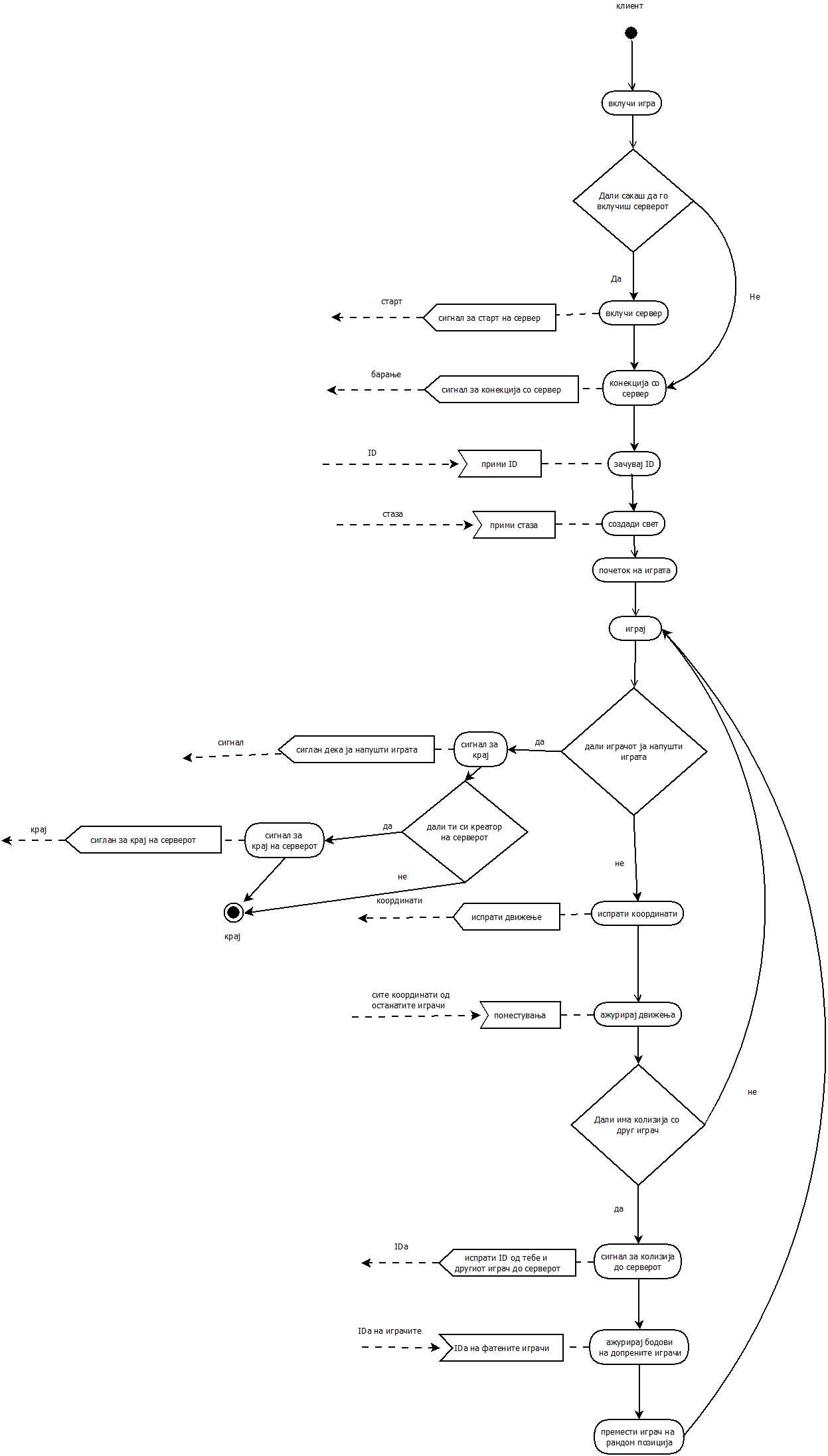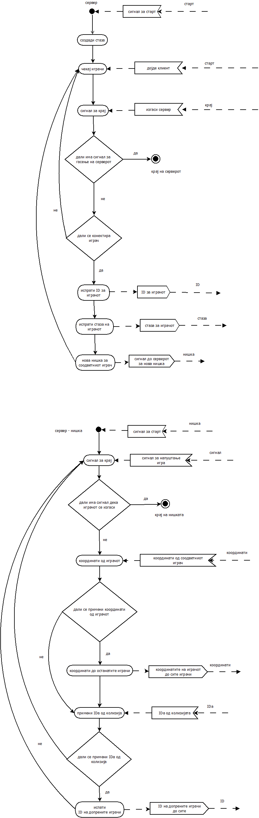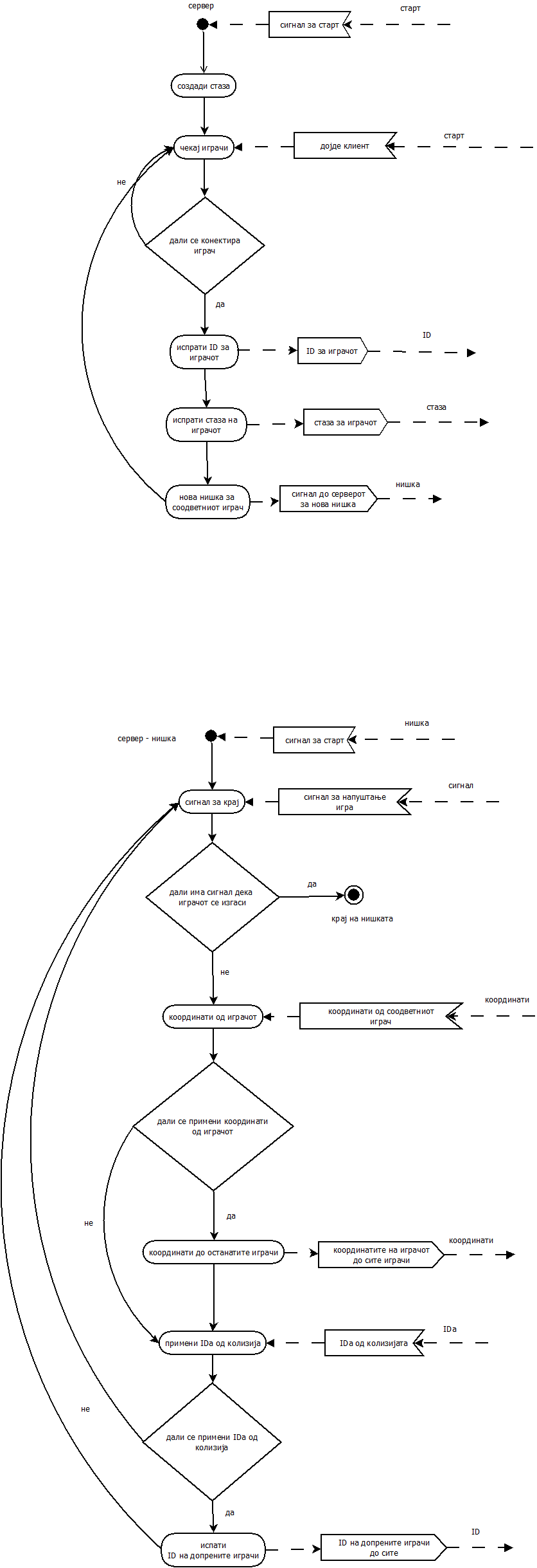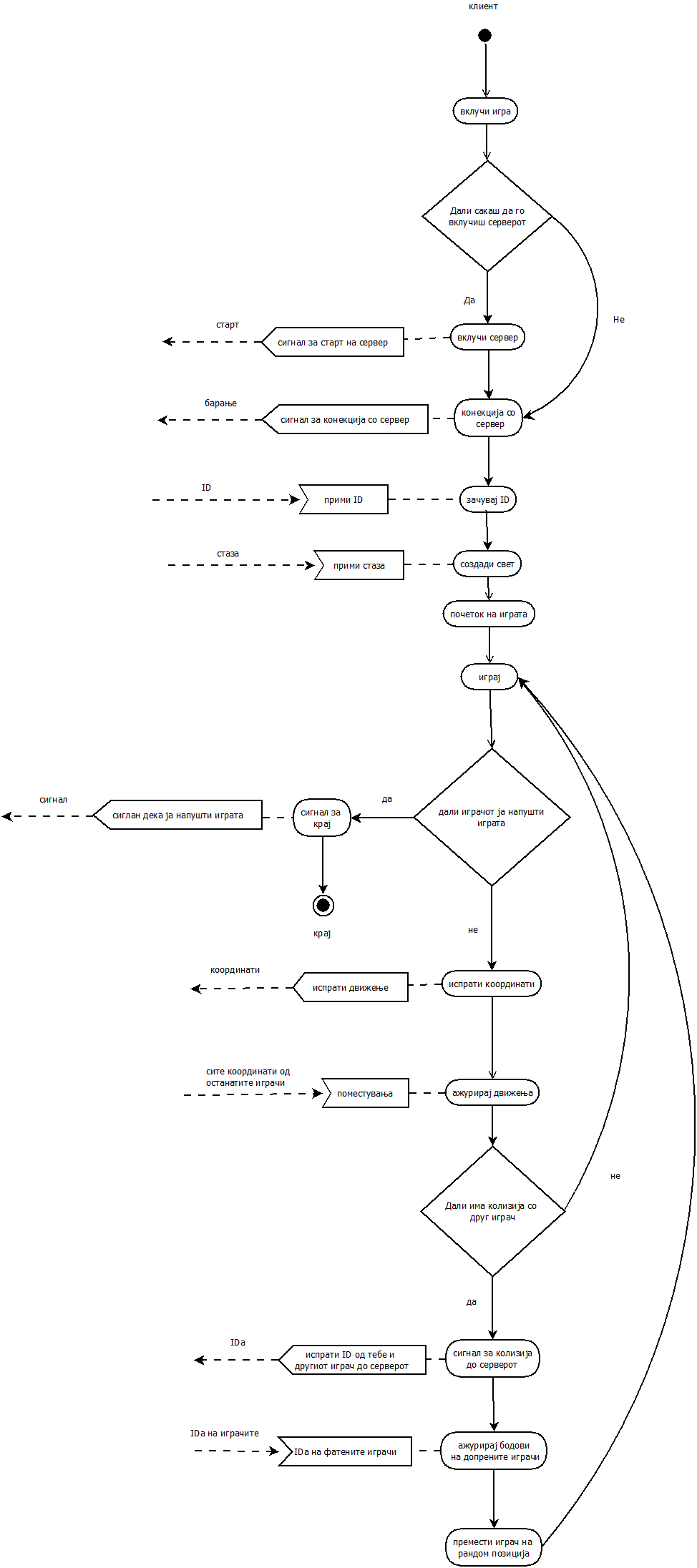 Првичната архитектура на системот ќе биде клиент-сервер архитектура. Сите играчи, во случајов клиенти се приклучени на една сентрална машина наречена сервер. Серверот е одговорен за сите важни одлуки, управување со состојбите и праќање информации до секој посебен клиент. Во случајот на “Брканица” серверот се грижи за собирање на моменталните координати на секој од играчите и праќање на истите со секој од клиентите. Како резултат на сето ова серверот станува клучна точка во пропустниот опсег и пресметките. Серверот мора да праќа и прима податоци до N независни текови.
