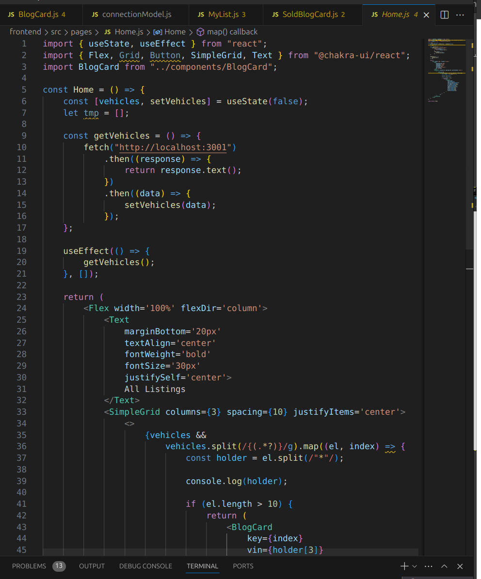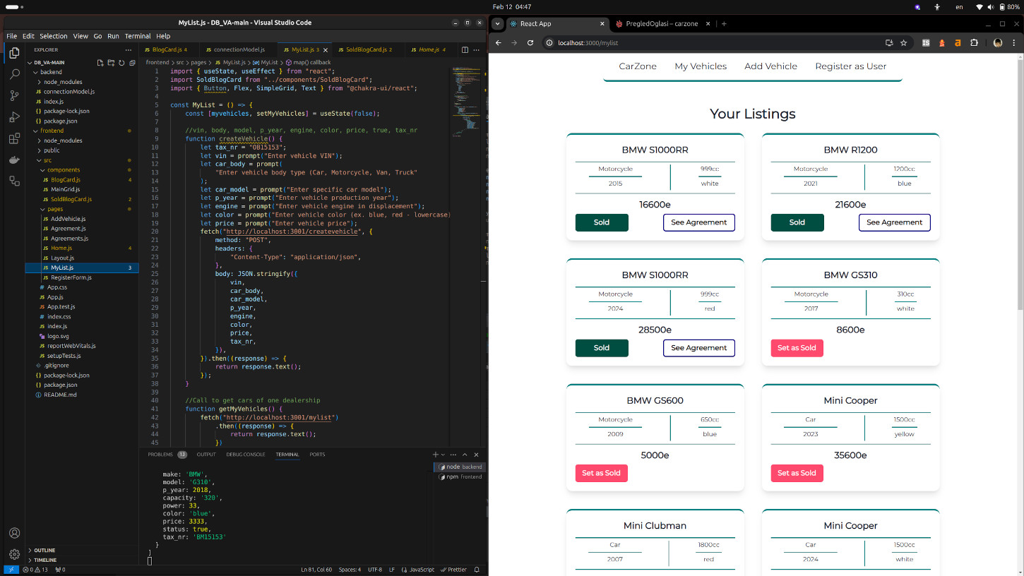 Ова е како изгледа апликацијата. Повторно, имаме функција getMyVehicles која ги враќа сите мои возила. Не се користи createVehicle бидејќи креирањето на нов оглас е на нова страна, ова треба само да се отстрани.
